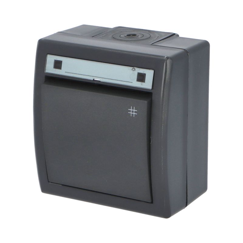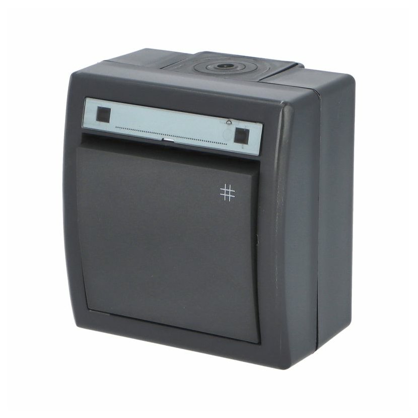 ATLAS 2K 19077-07 IP55 Tlačítko symbol "zvonek" č.1/0, na povrch, šedé. Provedení v šedé barvě RAL 7035 a ovládacím prvkem v barvě RAL 7016. Rozteč kotvících bodů (výška x šířka ): 61x49mm.