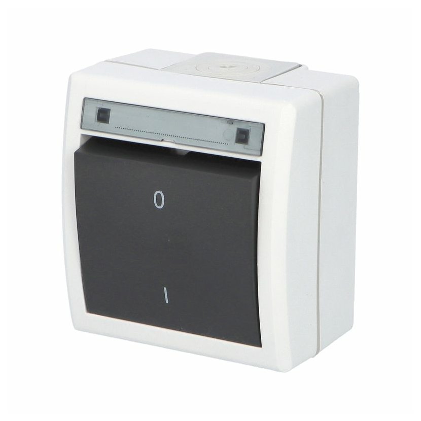 ATLAS 19085 IP55 Spínač dvoupólový č.2, na povrch, šedý. Provedení v šedé barvě RAL 7035 a ovládacím prvkem v barvě RAL 7043. Rozteč kotvících bodů (výška x šířka ): 61x49mm.