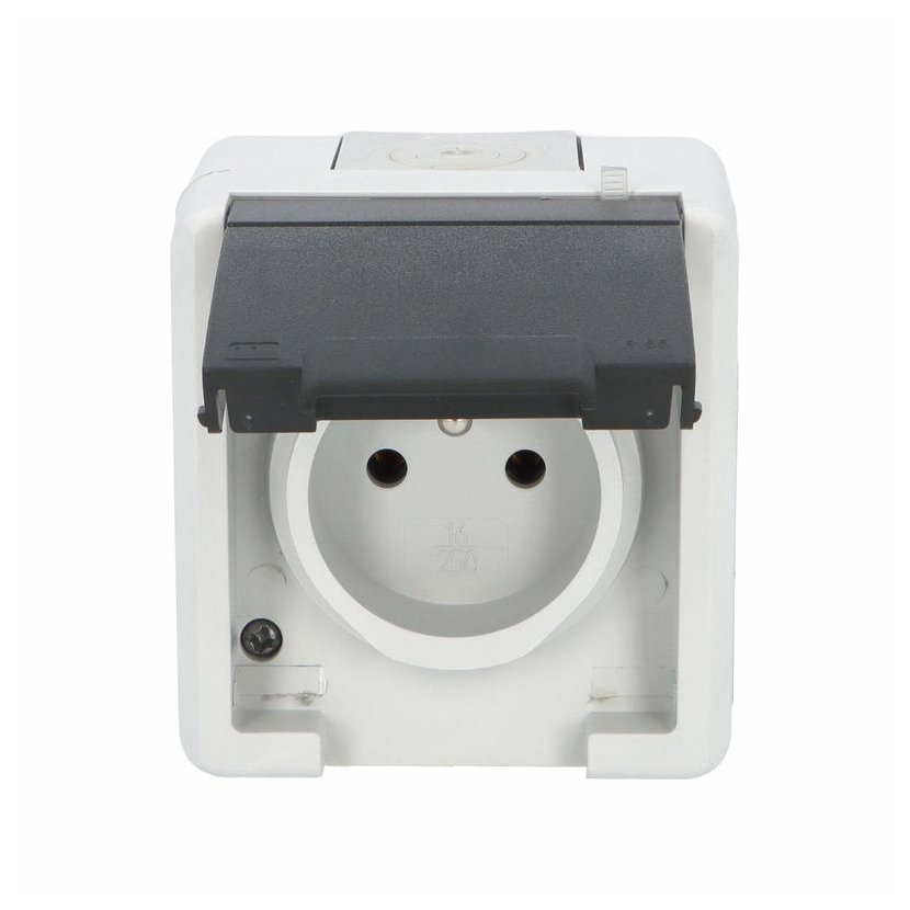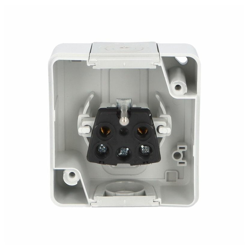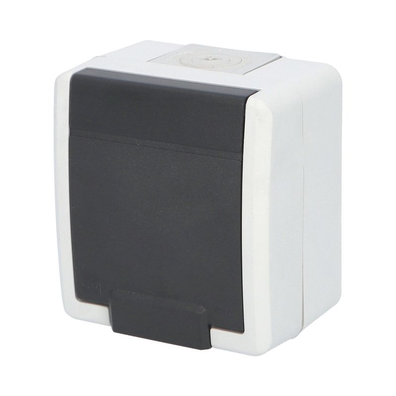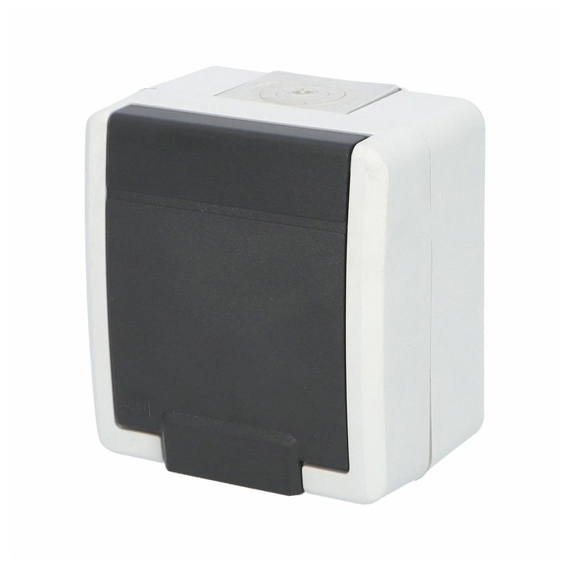 ATLAS 19082 IP55 Zásuvka 2P+PE s ochr. kolíkem, na povrch, šedá. Provedení v šedé barvě RAL 7035 a ovládacím prvkem v barvě RAL 7043. Rozteč kotvících bodů (výška x šířka ): 63x59mm.