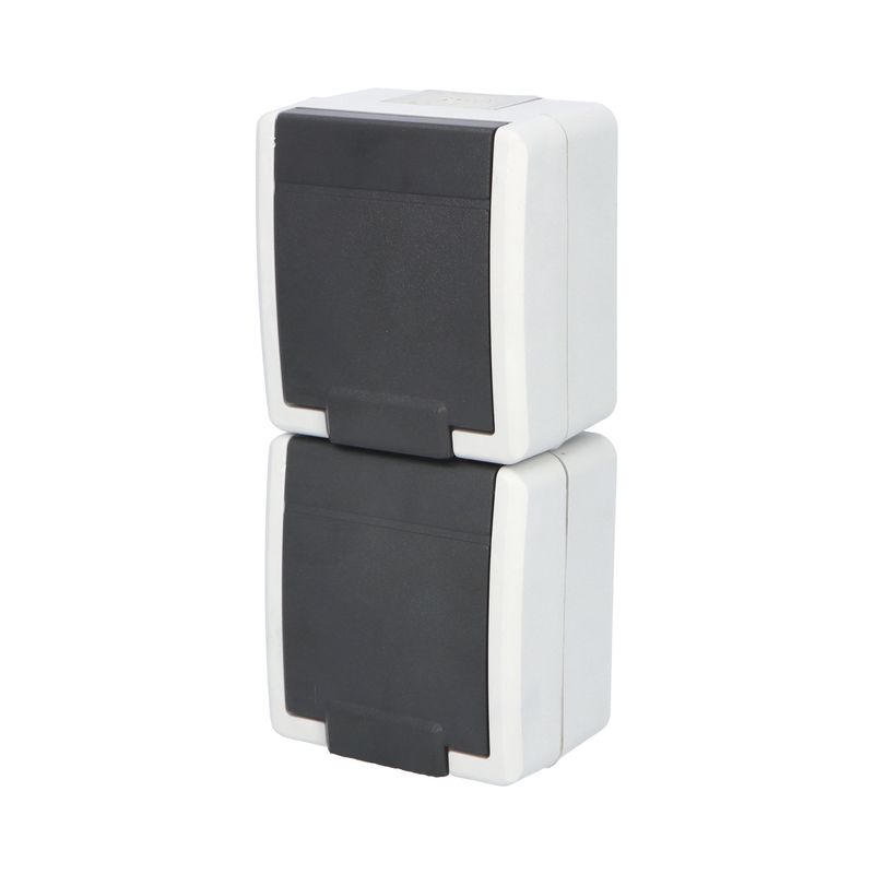ATLAS 2K 19087-09 IP55 Zásuvka 2x 2P+PE, 2-násobná svislá s ochr. kolíkem, na povrch, antracitová RAL 7016. Rozteč kotvících bodů (výška x šířka ): 146x59mm.
