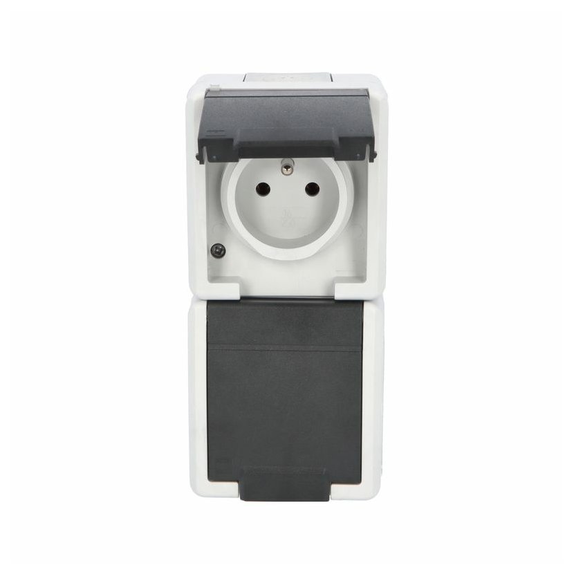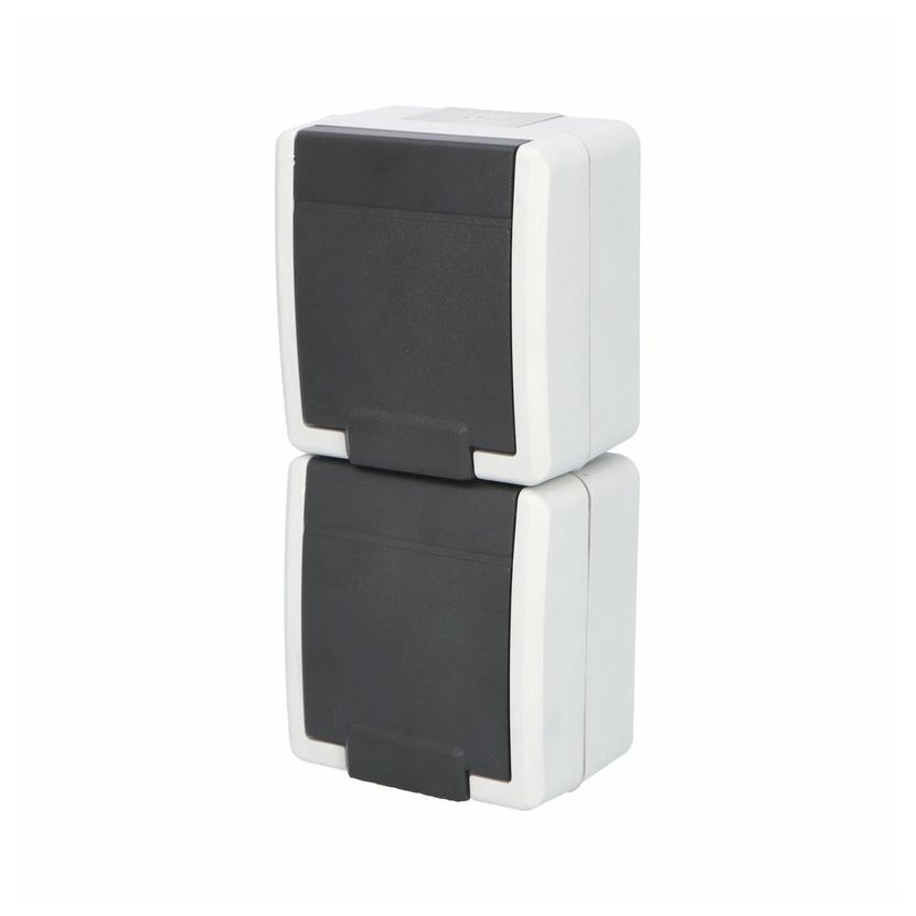 ATLAS 19083 IP55 Zásuvka 2x 2P+PE, 2-násobná vodorovná s ochr. kolíkem, na povrch, šedá. Provedení v šedé barvě RAL 7035 a ovládacím prvkem v barvě RAL 7043. Rozteč kotvících bodů (výška x šířka ):…