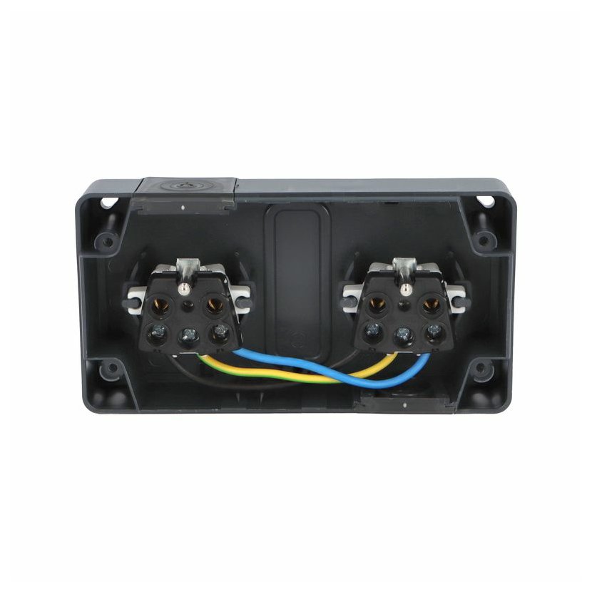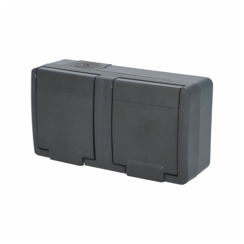 ATLAS 2K 19087-09 IP55 Zásuvka 2x 2P+PE, 2-násobná svislá s ochr. kolíkem, na povrch, antracitová RAL 7016. Rozteč kotvících bodů (výška x šířka ): 146x59mm.