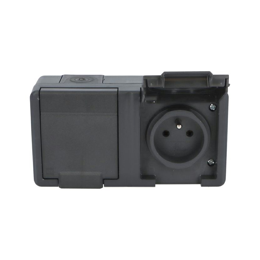 ATLAS 2K 19094-07 IP55 Přepínač č.6 + zásuvka 2x 2P+PE, 2-násobná vodorovně s ochr. kolíkem, na povrch, šedý. Provedení v šedé barvě RAL 7035 a ovládacím prvkem v barvě RAL 7016. Rozteč kotvících bodů…