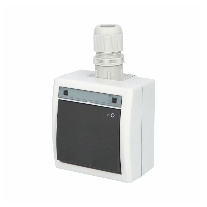 ATLAS 2K 19098-07 IP55 Tlačítko symbol "klíč" č.1/0,, na povrch, šedý. Provedení v šedé barvě RAL 7035 a ovládacím prvkem v barvě RAL 7016. Rozteč kotvících bodů (výška x šířka ): 61x49mm.