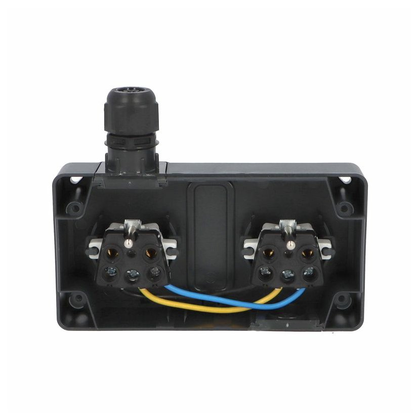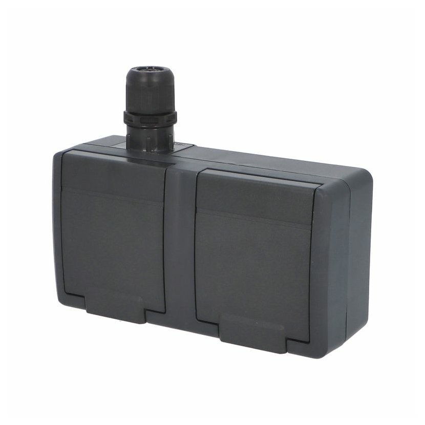 ATLAS 2K 19083-09 IP55 Zásuvka 2x 2P+PE, 2-násobná vodorovná s ochr. kolíkem, na povrch, antracitová RAL 7016. Rozteč kotvících bodů (výška x šířka ): 63x136mm.
