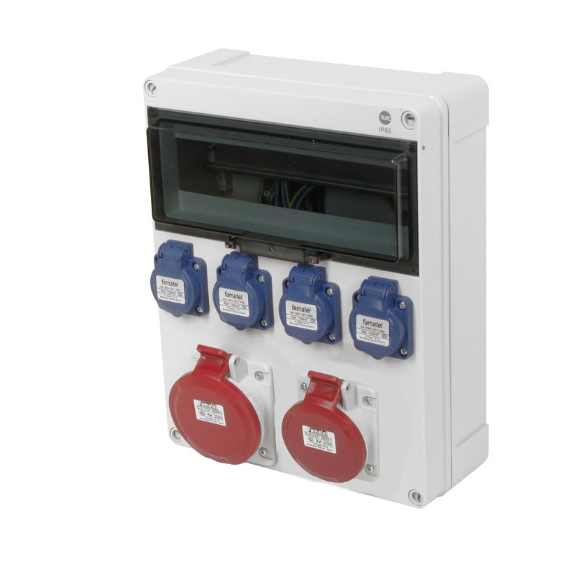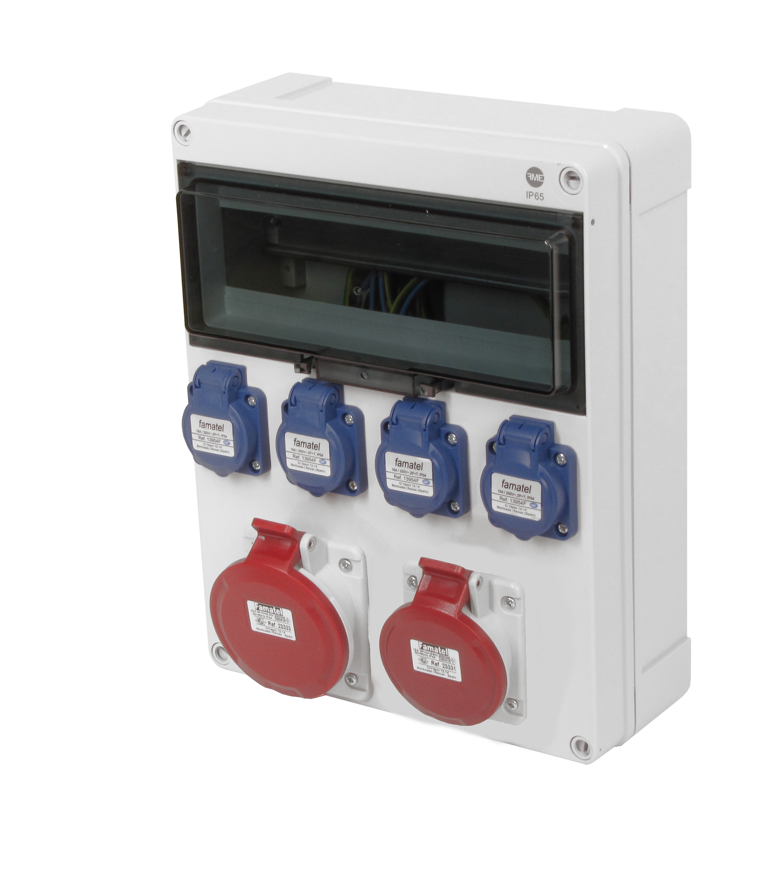 Zásuvková skříň FAMATEL fb34005-6kA - ZSF40101000.1 /5813 IP54 jištěná s chráničem 40/4/003-A, zásuvky 4x230V, 1x16/5, 1x32/5, přístroje EATON 6kA: 2xPL6-B16/1, 1xPL6-B16/3, 1xPL6-B32/3,…