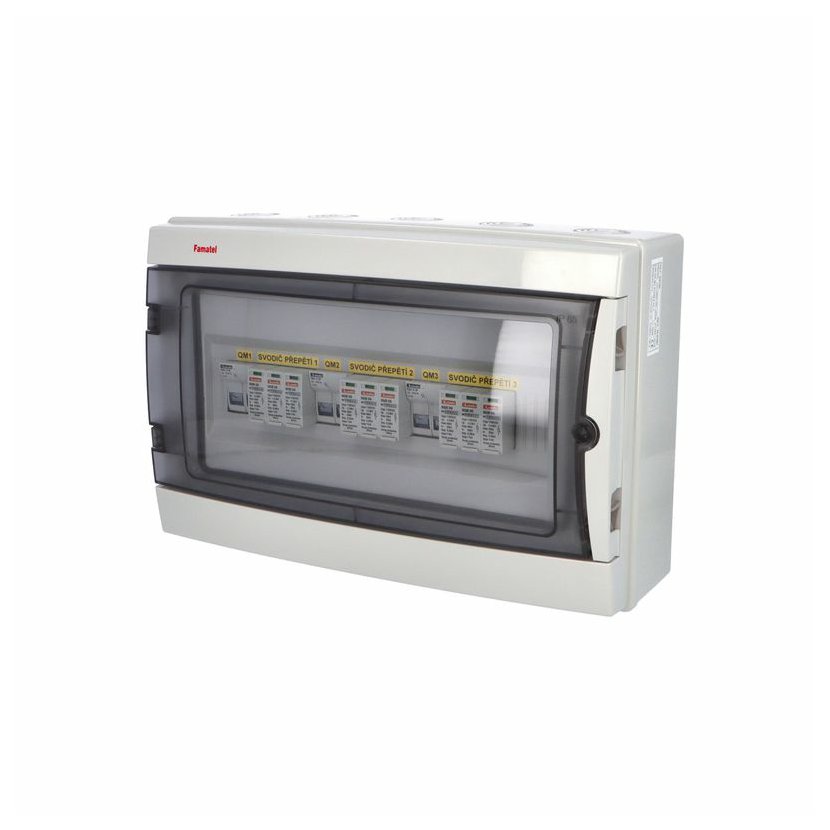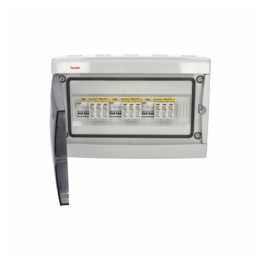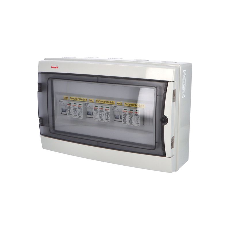 Fotovoltaická rozvodnice FAMATEL SolarBOX fr016L IP65 chránící DC vedení o max. napětí 1000V, pro tři stringy. Osazena jistícími a ochrannými prvky: 3 x pojistkový odpojovač 1000V DC, 2P 10x38, bez pojistek, 3 x svodič přepětí LOVATO 1000V DC typ I+II, 6x RSA svorka, použité pouzdro: 39181 - 274x426x131mm, barva: světle šedá.