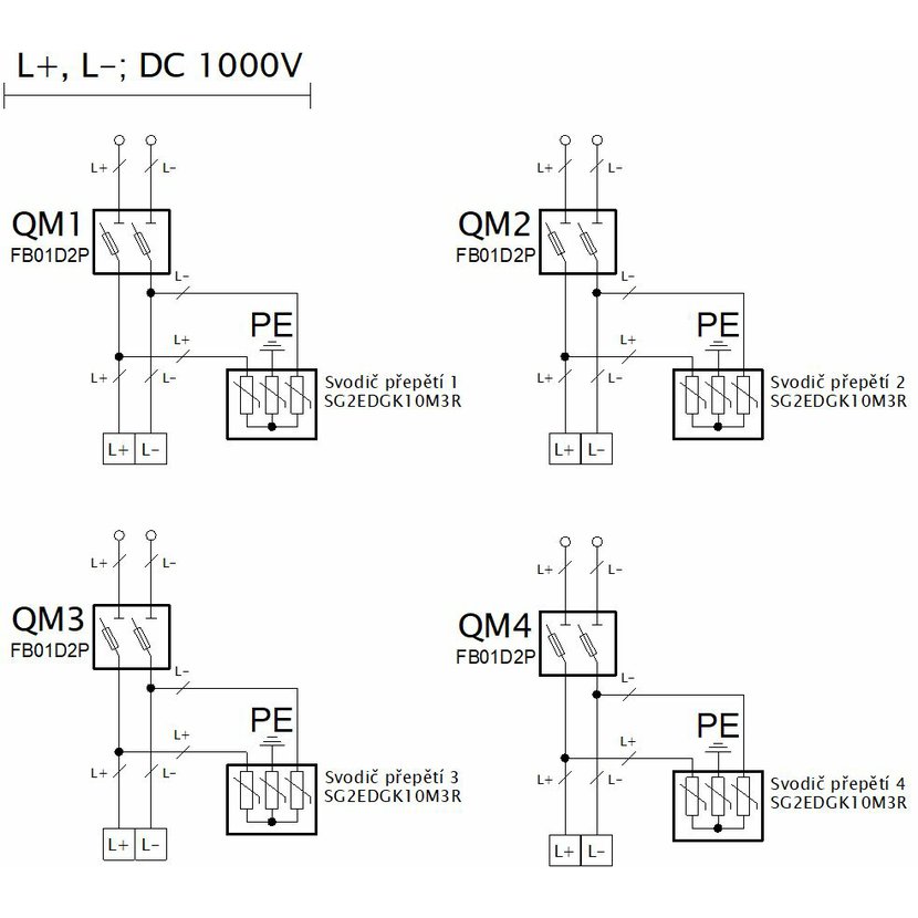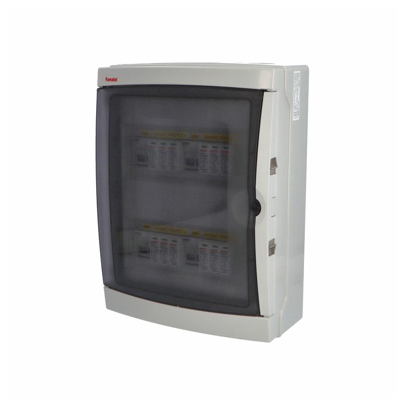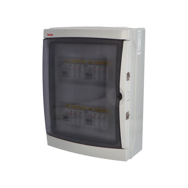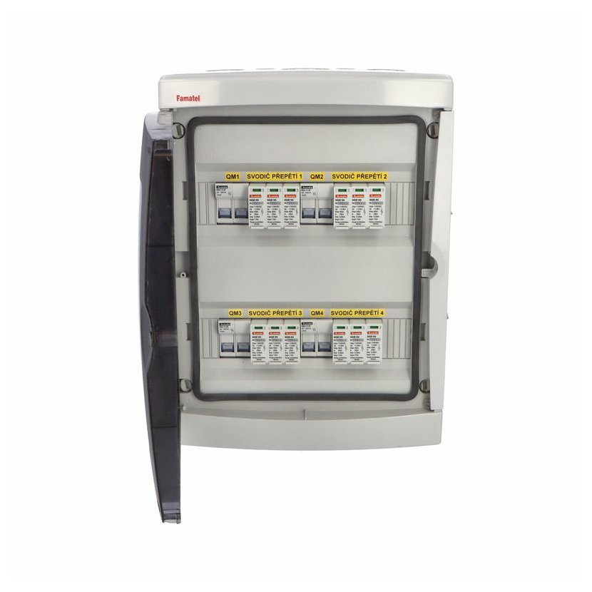 Fotovoltaická rozvodnice FAMATEL SolarBOX fr030L IP65 chránící DC vedení o max. napětí 1000V, pro čtyři stringy. Osazena jistícími a ochrannými prvky: 4 x pojistkový odpojovač LOVATO 1000V DC, 2P 10x38, bez pojistek, 4 x svodič přepětí LOVATO 1100V DC typ I+II, použité pouzdro: 39261 - 310x410x150mm, barva: světle šedá.