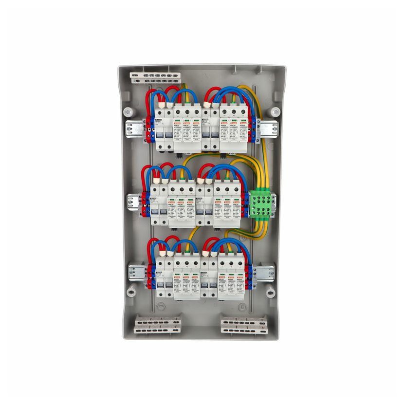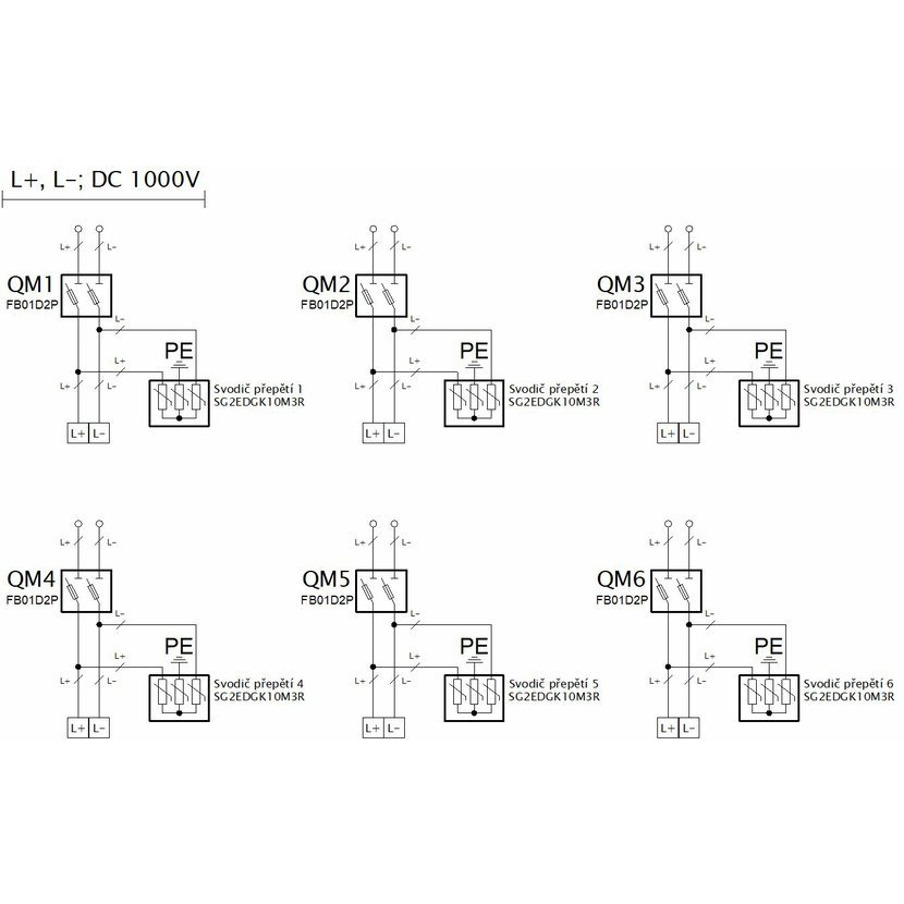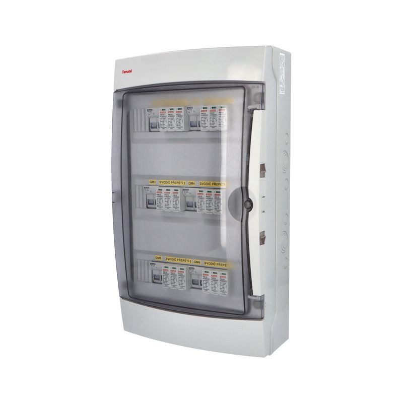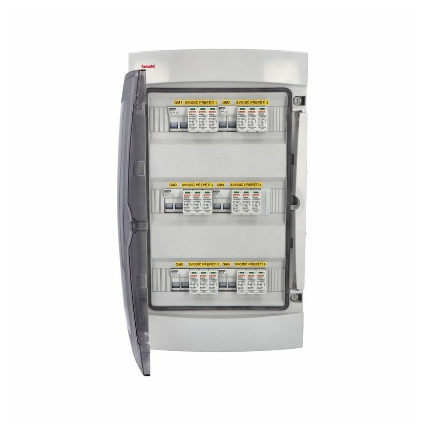 Fotovoltaická rozvodnice FAMATEL SolarBOX fr032L IP65 chránící DC vedení o max. napětí 1000V, pro šest stringů. Osazena jistícími a ochrannými prvky: 6 x pojistkový odpojovač LOVATO 1000V DC, 2P 10x38, bez pojistek, 6 x svodič přepětí LOVATO 1100V DC typ I+II, použité pouzdro: 39421 - 565x325x150mm, barva: světle šedá.