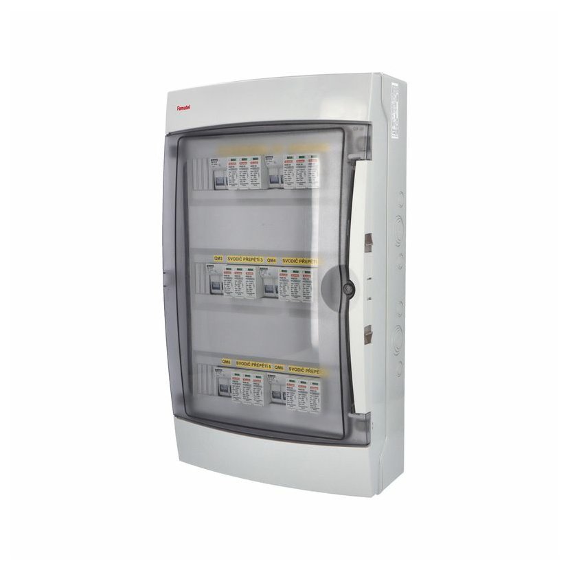 Fotovoltaická rozvodnice (rozváděč nízkého napětí) SolarBOX fr032L IP65 chránící DC vedení o max. napětí 1000V, pro šest stringů. Osazena jistícími a ochrannými prvky: 6 x pojistkový odpojovač 1000V DC, 2P 10x38, bez pojistek, 6 x svodič přepětí LOVATO 1000V DC typ I+II, 12x RSA svorka, použité pouzdro: 39421 - celkem k dispozici 42mod. míst, rozměry: 565x325x150mm, plastová, materiál ABS, IK08, zkouška žhavou smyčkou 650°C, bezhalogenová a UV odolná, montáž na povrch, barva: světle šedá, rozsah teplot -25°C + 70°C, aplikované normy: ČSN EN 61439-2 ed. 2, balení: 1ks (fólie), PE svorkovnice součástí (2x16 mm2 + 12x10 mm2) / N svorkovnice součástí (2x16 mm2 + 12x10 mm2), hladké boky (stěny) - pro vyvrtání otvoru a osazení vývodkou (vrchní a spodní strana má stěny s předlisovanými vstupy pro vyvrtání vstupního otvoru a následného osazení příslušnou vývodkou), dodáno s průvodní dokumentací: štítkem rozváděče, návodem pro obsluhu a montáž, krycím listem (charakteristiky rozhraní), protokolem o kusové zkoušce, ES prohlášením o shodě, schématem zapojení a zkouškou oteplení pro rozváděče nízkého napětí. Pro montáž na hořlavé podklady je nutné použít nehořlavou podložku. Recyklační poplatek je zahrnut v ceně výrobku.