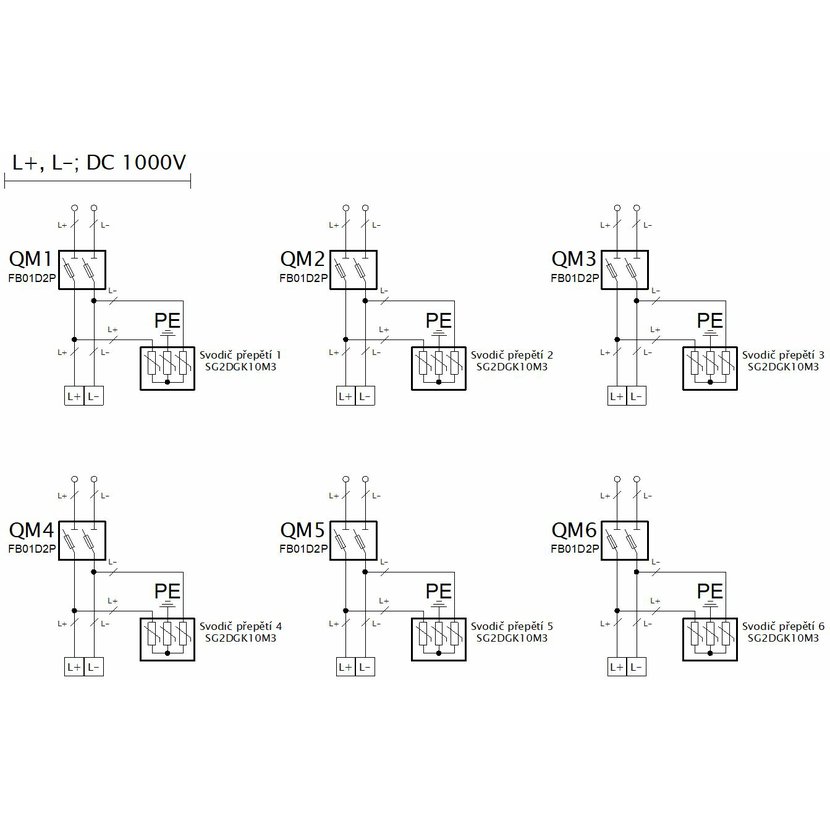Fotovoltaická rozvodnice FAMATEL SolarBOX fr100L IP65 chránící DC vedení o max. napětí 1000V, pro šest stringů. Osazena jistícími a ochrannými prvky: 6 x pojistkový odpojovač LOVATO 1000V DC, 2P 10x38, bez pojistek, 6 x svodič přepětí LOVATO 1100V DC typ II, použité pouzdro: 39421 - 565x325x150mm, barva: světle šedá.