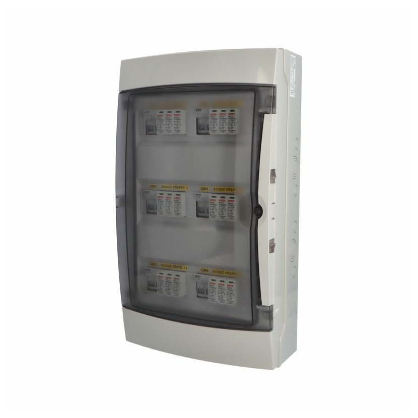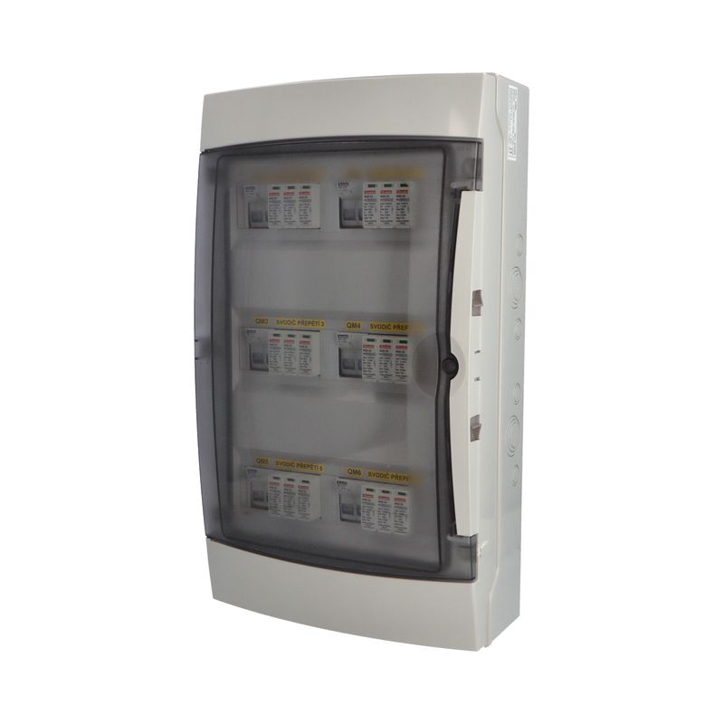 Fotovoltaická rozvodnice (rozváděč nízkého napětí) SolarBOX fr100L IP65 chránící DC vedení o max. napětí 1000V, pro šest stringů. Osazena jistícími a ochrannými prvky: 6 x pojistkový odpojovač 1000V DC, 2P 10x38, bez pojistek, 6 x svodič přepětí LOVATO 1000V DC typ II, 12x RSA svorka, použité pouzdro: 39421 - celkem k dispozici 42mod. míst, rozměry: 565x325x150mm, plastová, materiál ABS, IK08, zkouška žhavou smyčkou 650°C, bezhalogenová a UV odolná, montáž na povrch, barva: světle šedá, rozsah teplot -25°C + 70°C, aplikované normy: ČSN EN 61439-2 ed. 2, balení: 1ks (fólie), PE svorkovnice součástí (2x16 mm2 + 12x10 mm2) / N svorkovnice součástí (2x16 mm2 + 12x10 mm2), hladké boky (stěny) - pro vyvrtání otvoru a osazení vývodkou (vrchní a spodní strana má stěny s předlisovanými vstupy pro vyvrtání vstupního otvoru a následného osazení příslušnou vývodkou), dodáno s průvodní dokumentací: štítkem rozváděče, návodem pro obsluhu a montáž, krycím listem (charakteristiky rozhraní), protokolem o kusové zkoušce, ES prohlášením o shodě, schématem zapojení a zkouškou oteplení pro rozváděče nízkého napětí. Pro montáž na hořlavé podklady je nutné použít nehořlavou podložku. Recyklační poplatek je zahrnut v ceně výrobku.