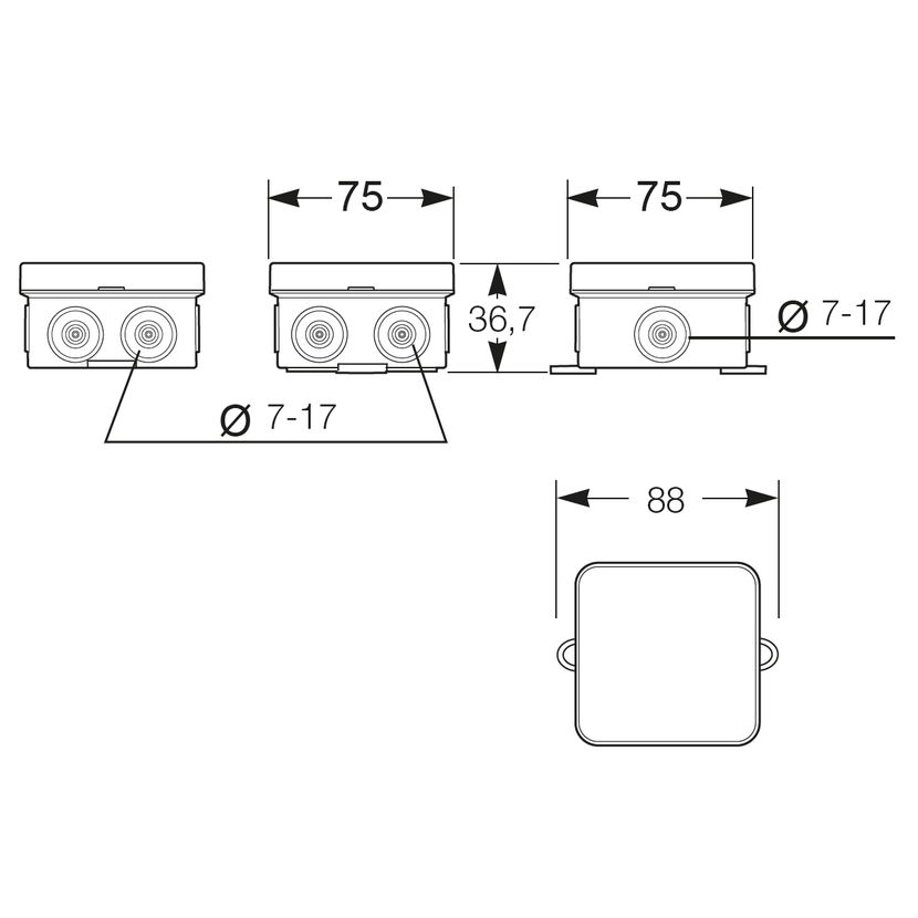 Parametry produktu Krabice K8 IP55 rozbočovací, s naklapávacím víčkem, 75x75x36mm
