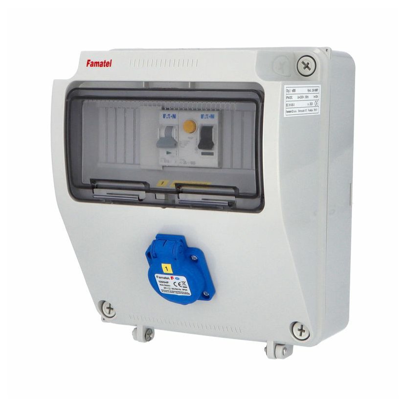 Zásuvková skříň FAMATEL v2040 - ZSFT11101010.1 /3977 IP54 jištěná s chráničem 63/4/003-A, zásuvky 1x230V, 1x24V, 1x16/5, 1x32/5, 1x63/5, přístroje EATON 10kA: 1xPL7-B16/1, 1xPL7-B6/2, 1xPL7-B16/3,…