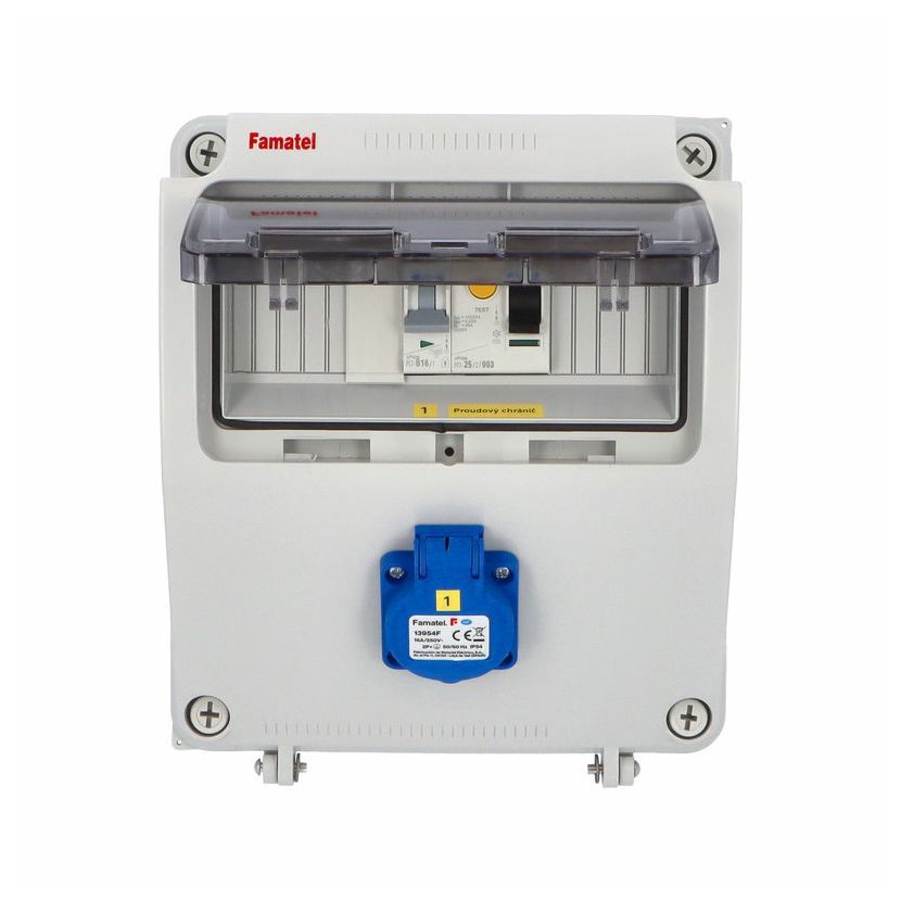 Zásuvková skříň FAMATEL v008-ZSF00100000.1 /3927 IP54 jištěná s chráničem 25/2/003-A, zásuvky 1x230V, přístroje EATON 10kA: 1xPL7-B16/1, PF7-25/2/003-A na vstupu, použité pouzdro: 3927 -…