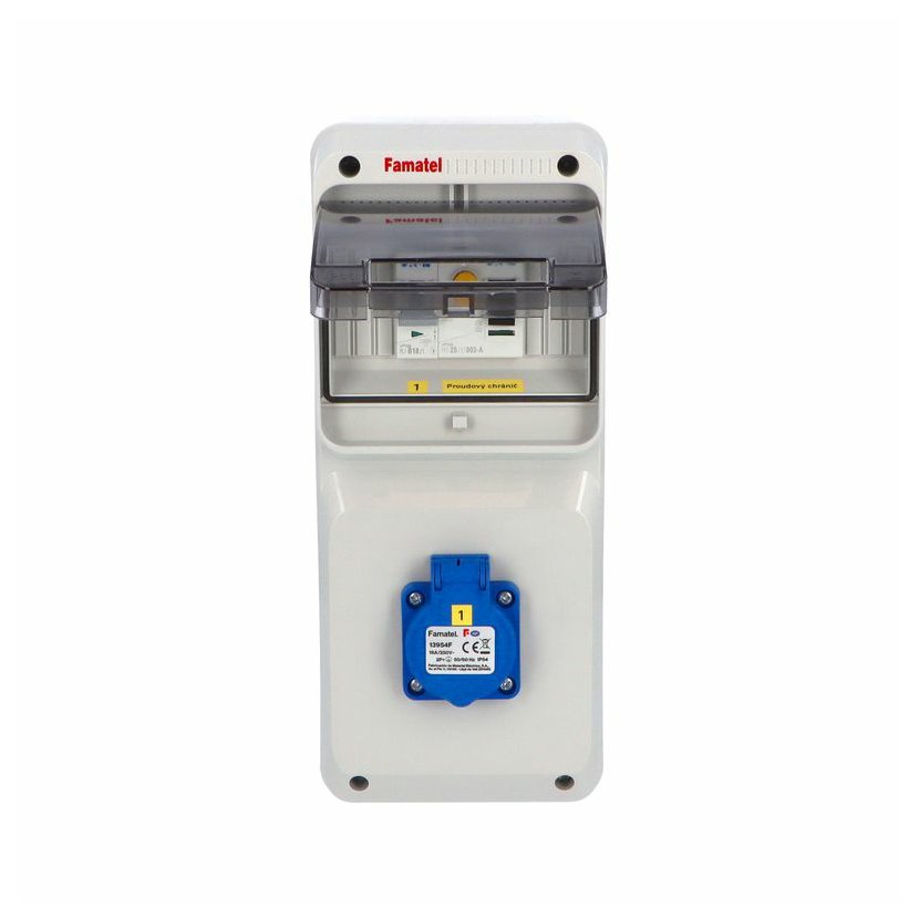 Zásuvková skříň FAMATEL v005-ZSF00100000.1 /3957 IP54 jištěná s chráničem 25/2/003-A, zásuvky 1x230V, přístroje EATON 10kA: 1xPL7-B16/1, PF7-25/2/003-A na vstupu, použité pouzdro: 3957 -…