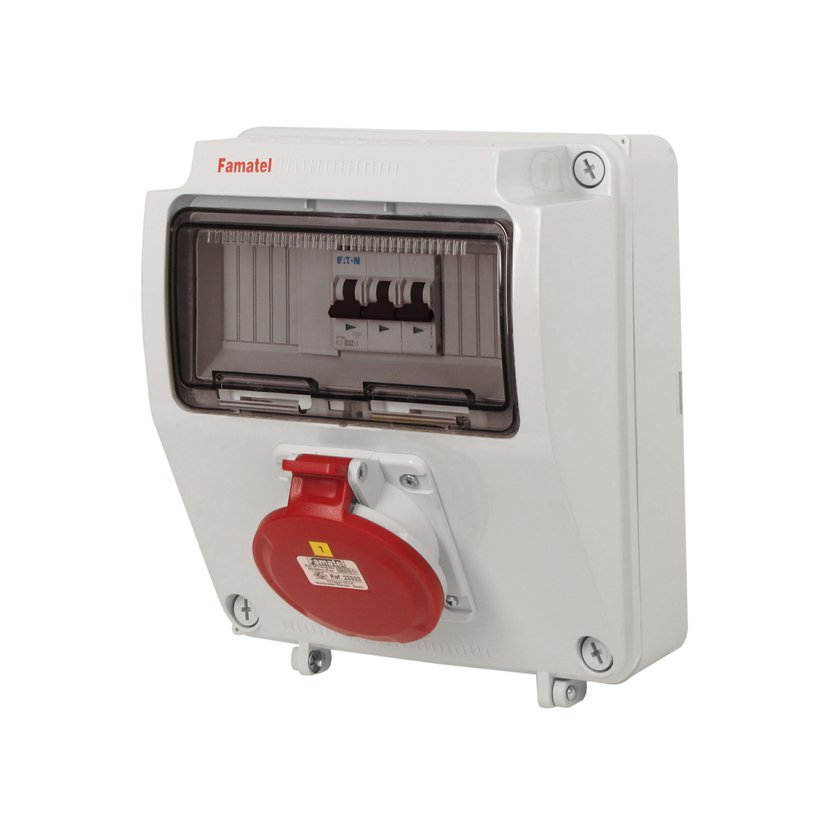 Přenosná zásuvková skříň FAMATEL eb385-6kA-EB201010.1 /4M IP44 jištěná bez chrániče, zásuvky 2x230V, 1x16/5, 1x32/5, přístroje EATON 6kA: 1xPL6-B16/1, 1xPL6-B16/3, použité pouzdro: 6201-10 (4mod.) -…