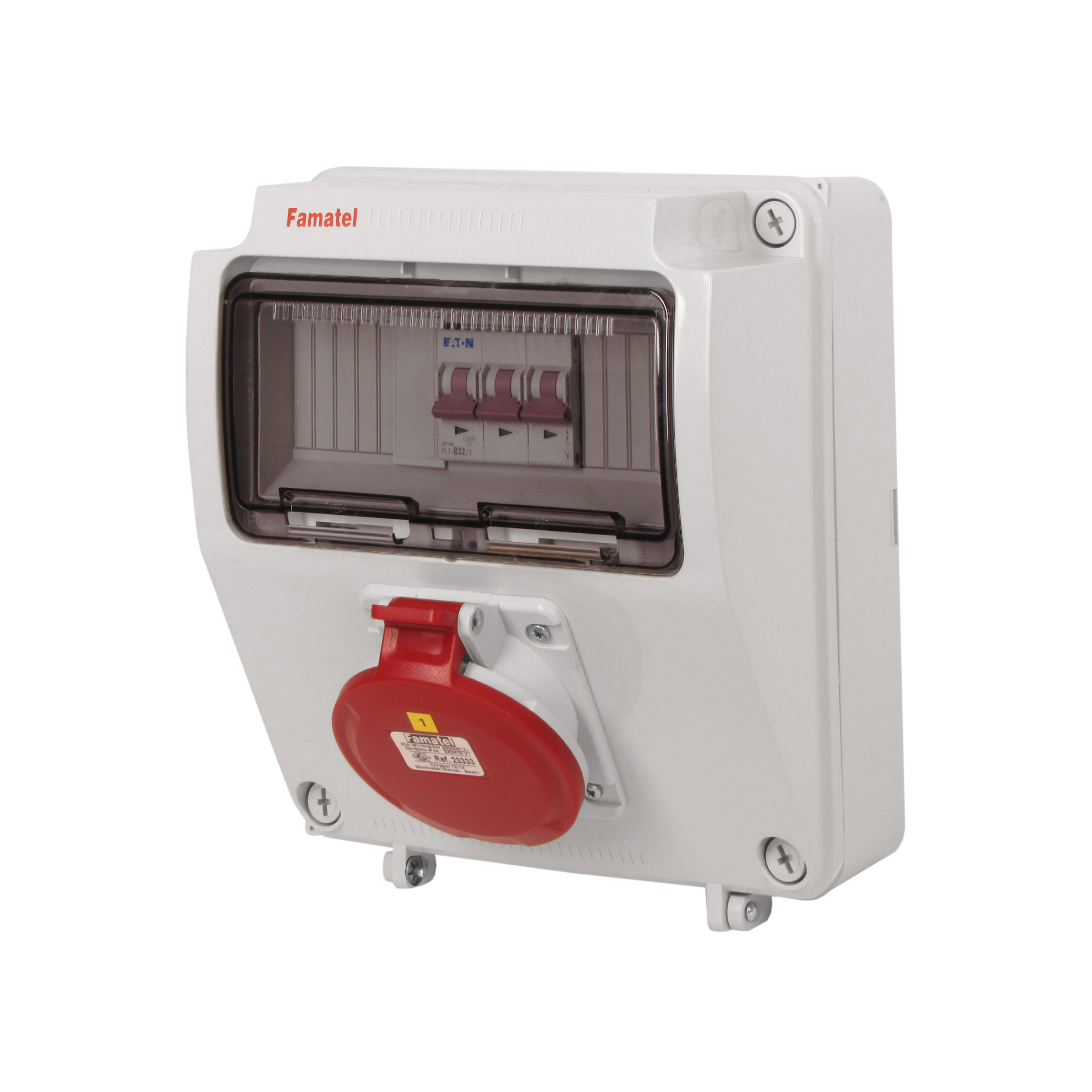 Zásuvková skříň FAMATEL rb554-RB30101000.0 /4102 IP65 jištěná bez chrániče, zásuvky 3x230V, 1x16/5, 1x32/5, přístroje EATON 10kA: 3xPL7-B16/1, 1xPL7-B16/3, 1xPL7-B32/3, použité pouzdro: 4102 -…