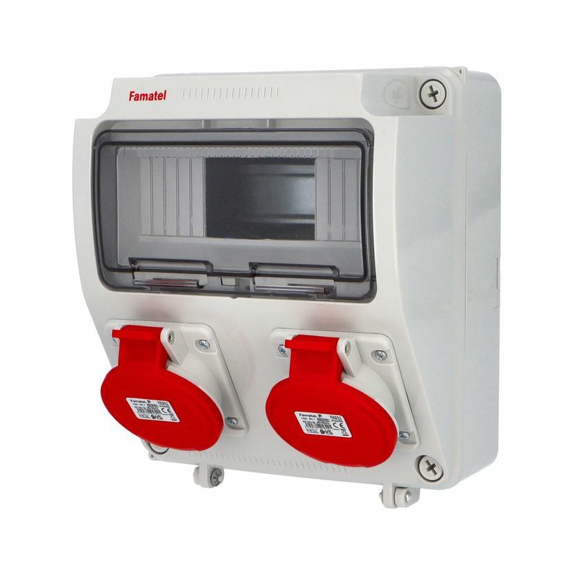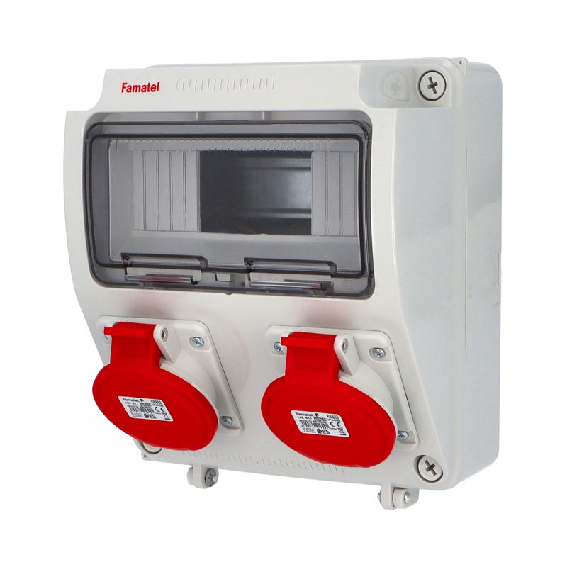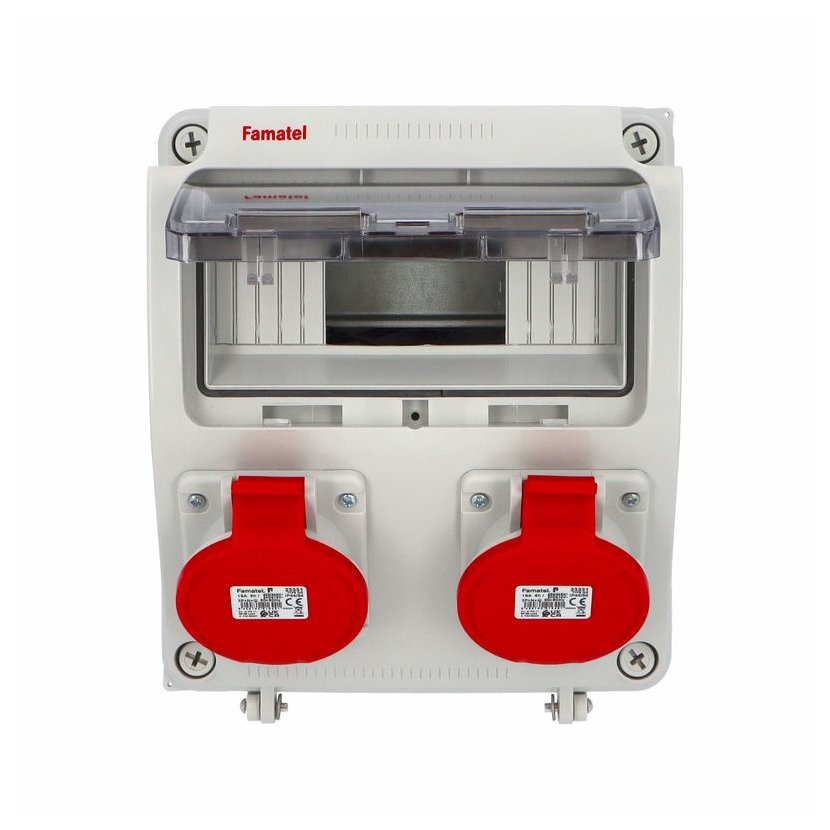 Zásuvková skříň (rozváděč nízkého napětí) FAMATEL v025-ZSF00200000.V /3957 IP54/pouze vydrátovaná, zásuvky 2x400V/16A, na vstupu (citlivost na reziduální proud 30mA), použité pouzdro: 3957 - celkem k dispozici 9mod. míst, rozměry: 245x215x155mm, plastová, materiál ABS, IK08, zkouška žhavou smyčkou 650°C, bezhalogenová a UV odolná, montáž na povrch, barva: světle šedá, rozsah teplot -25°C + 85°C, aplikované normy: IEC 61439-3 (Rozváděče nízkého napětí - Část 3: Rozvodnice určené k provozování laiky (DBO), balení: 1ks (fólie), zásuvky na 230V/16A s ochranným kolíkem dle ČSN, polykarbonátové okénko, jistící prvky EATON, PE svorkovnice součástí (6x16mm2), N svorkovnice součástí (6x16mm2), hladké stěny (bez prolisů) pro vyvrtání vstupního otvoru a následné osazení příslušnou vývodkou (pro CYKY 5x6; 4x10; 5x10 => M25; pro CYKY 5x16 => M32), max. připojitelný vstupní kabel = 4x25 nebo 5x16 (Cu), dodáno s průvodní dokumentací: štítkem rozváděče, návodem pro obsluhu a montáž, krycím listem (charakteristiky rozhraní), protokolem o kusové zkoušce, ES prohlášením o shodě, schématem zapojení a zkouškou oteplení pro rozváděče nízkého napětí. Pro montáž na hořlavé podklady je nutné použít nehořlavou podložku.