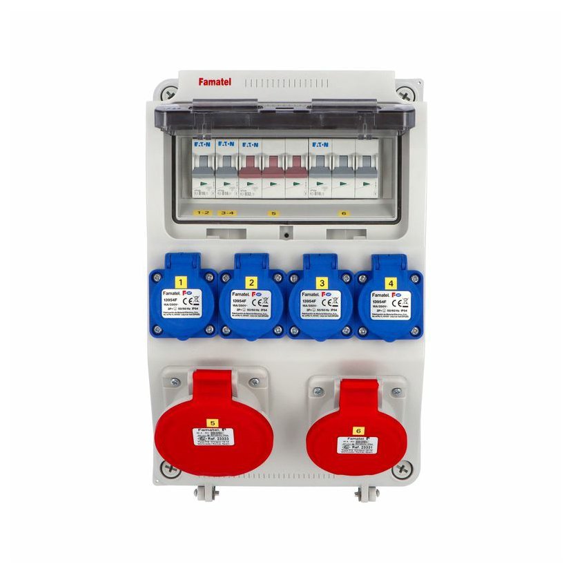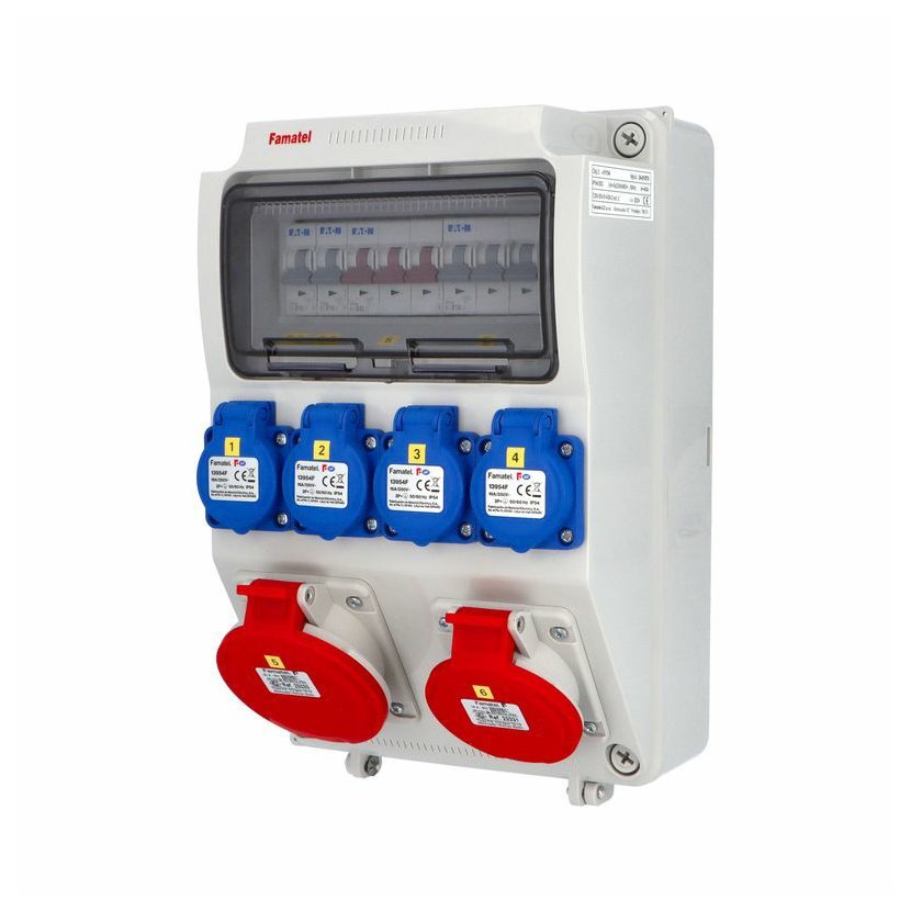 Zásuvková skříň (rozváděč nízkého napětí) FAMATEL v1114-ZSF40101000.0 /3958 IP54 jištěná bez chrániče, zásuvky 4x230V/16A (s ochranným kolíkem dle ČSN), 1x400V/16A/5pól, 1x400V/32A/5pól, jistící přístroje EATON 10kA: 2xPL7-B16/1, 1xPL7-B16/3, 1xPL7-B32/3, použité pouzdro: 3958 - celkem k dispozici 9mod. míst, rozměry: 330x215x155mm, plastová, materiál ABS, IK08, zkouška žhavou smyčkou 650°C, bezhalogenová a UV odolná, montáž na povrch, barva: světle šedá, rozsah teplot -25°C + 85°C, aplikované normy: IEC 61439-3 (Rozváděče nízkého napětí - Část 3: Rozvodnice určené k provozování laiky (DBO), balení: 1ks (fólie), zásuvky na 230V/16A s ochranným kolíkem dle ČSN, polykarbonátové okénko, jistící prvky EATON, PE svorkovnice součástí (6x16mm2), N svorkovnice součástí (6x16mm2), hladké stěny (bez prolisů) pro vyvrtání vstupního otvoru a následné osazení příslušnou vývodkou (pro CYKY 5x6; 4x10; 5x10 => M25; pro CYKY 5x16 => M32), max. připojitelný vstupní kabel = 4x25 nebo 5x16 (Cu), dodáno s průvodní dokumentací: štítkem rozváděče, návodem pro obsluhu a montáž, krycím listem (charakteristiky rozhraní), protokolem o kusové zkoušce, EU prohlášením o shodě, schématem zapojení a zkouškou oteplení pro rozváděče nízkého napětí.