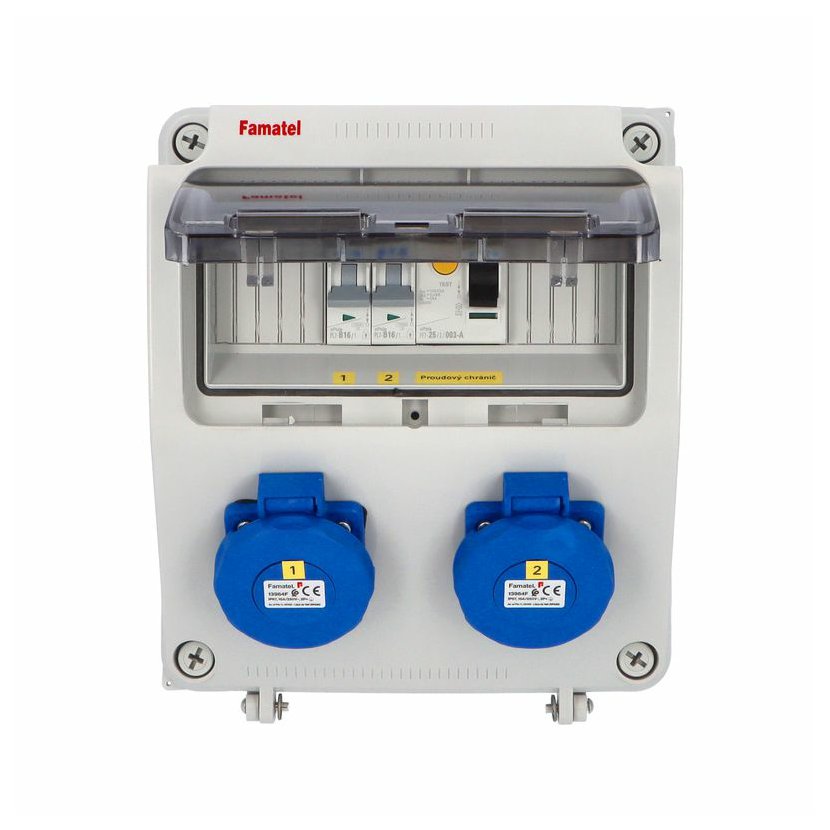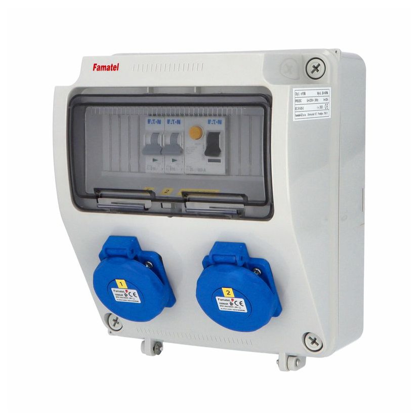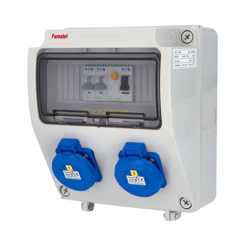 Zásuvková skříň FAMATEL fb190 - ZSF20001000.1 /5810 IP54 jištěná s chráničem 40/4/003-A, zásuvky 2x230V (natočené), 1x32/5, přístroje EATON 10kA: 2xPL7-B16/1, 1xPL7-B32/3, PF7-40/4/003-A na vstupu,…