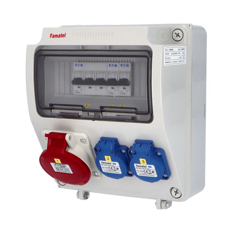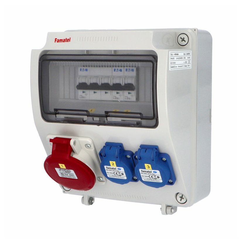 Zásuvková skříň FAMATEL v160-6kA-ZSF20100000.0 /3957 IP54, jištěná bez chrániče, zásuvky 1x400V/16A, 2x230V/16A, přístroje EATON 6kA: 2xPL6-B16/1, 1xPL6-B16/3, použité pouzdro: 3957 - celkem k dispozici 9mod. míst, rozměry: 245x215x155mm, plastová, materiál ABS, IK08, zkouška žhavou smyčkou 650°C, bezhalogenová a UV odolná, montáž na povrch, barva: světle šedá, rozsah teplot -25°C +85°C, aplikované normy: IEC 61439-3 (Rozváděče nízkého napětí - Část 3: Rozvodnice určené k provozování laiky (DBO), balení: 1ks (fólie), zásuvky na 230V/16A s ochranným kolíkem dle ČSN, polykarbonátové okénko, jistící prvky EATON, PE svorkovnice součástí (6x16mm2), N svorkovnice součástí (6x16mm2), hladké stěny (bez prolisů) pro vyvrtání vstupního otvoru a následné osazení příslušnou vývodkou (pro CYKY 5x6; 4x10; 5x10 => M25; pro CYKY 5x16 => M32), max. připojitelný vstupní kabel = 4x25 nebo 5x16 (Cu), dodáno s průvodní dokumentací: štítkem rozváděče, návodem pro obsluhu a montáž, krycím listem (charakteristiky rozhraní), protokolem o kusové zkoušce, ES prohlášením o shodě, schématem zapojení a zkouškou oteplení pro rozváděče nízkého napětí. Pro montáž na hořlavé podklady je nutné použít nehořlavou podložku. Recyklační poplatek je zahrnut v ceně výrobku.
