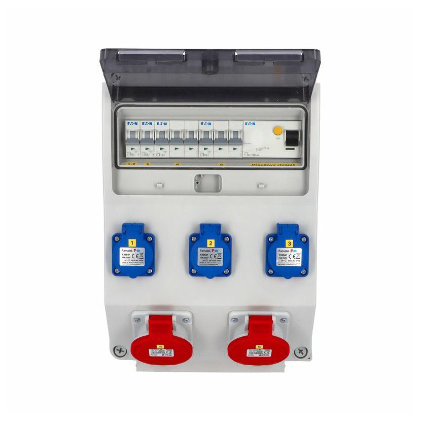 Zásuvková skříň (rozváděč nízkého napětí) v330-ZSF30200000.1 /3959 IP54 jištěná s chráničem 40/4/003-A, zásuvky 3x230V/16A (s ochranným kolíkem dle ČSN), 2x400V/16A/5pól, jistící přístroje EATON 10kA: 2xPL7-B16/1, 2xPL7-B16/3, PF7-40/4/003-A na vstupu (citlivost na reziduální proud 30mA), použité pouzdro: 3959 - celkem k dispozici 12mod. míst, rozměry: 398x266x153mm, plastová, materiál ABS, IK08, zkouška žhavou smyčkou 650°C, bezhalogenová a UV odolná, montáž na povrch, barva: světle šedá, rozsah teplot -25°C +85°C, aplikované normy: IEC 61439-3 (Rozváděče nízkého napětí - Část 3: Rozvodnice určené k provozování laiky (DBO), balení: 1ks (fólie), zásuvky na 230V/16A s ochranným kolíkem dle ČSN, polykarbonátové okénko, jistící prvky EATON, PE svorkovnice součástí (6x16mm2), N svorkovnice součástí (6x16mm2), stěny s předlisovanými vstupy pro vyvrtání vstupního otvoru a následné osazení příslušnou vývodkou (pro CYKY 5x6; 4x10; 5x10 => M25; pro CYKY 5x16 => M32), max. připojitelný vstupní kabel = 4x25 nebo 5x16 (Cu), dodáno s průvodní dokumentací: štítkem rozváděče, návodem pro obsluhu a montáž, krycím listem (charakteristiky rozhraní), protokolem o kusové zkoušce, ES prohlášením o shodě, schématem zapojení a zkouškou oteplení pro rozváděče nízkého napětí. Pro montáž na hořlavé podklady je nutné použít nehořlavou podložku. Recyklační poplatek je zahrnut v ceně výrobku.