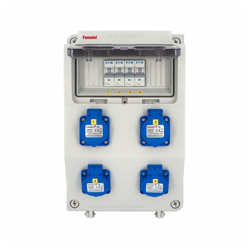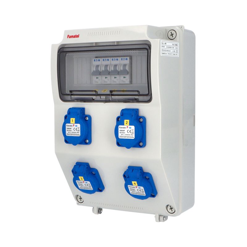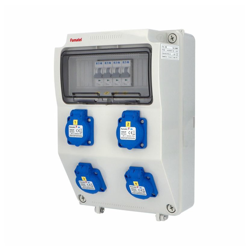 Zásuvková skříň FAMATEL v1120 - ZSF40200000.0 /3958 IP54 jištěná bez chrániče, zásuvky 4x230V, 2x16/5, přístroje EATON 10kA: 2xPL7-B16/1, 2xPL7-B16/3, použité pouzdro: 3958 - 330x215x155mm, barva:…