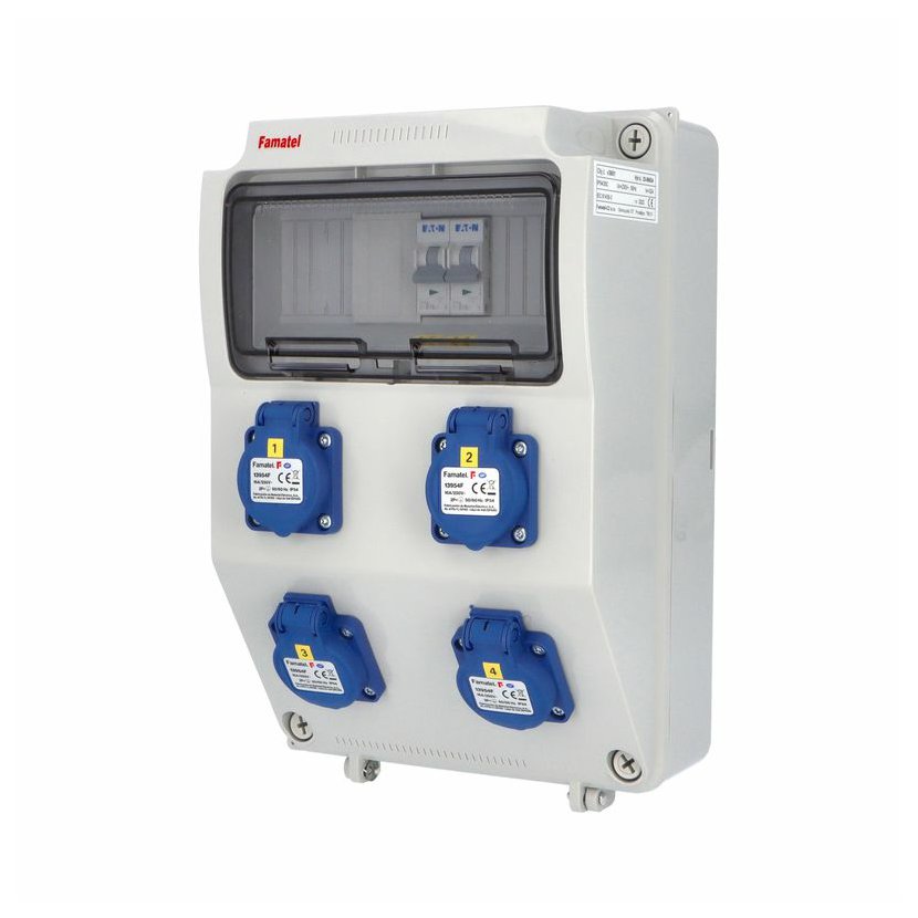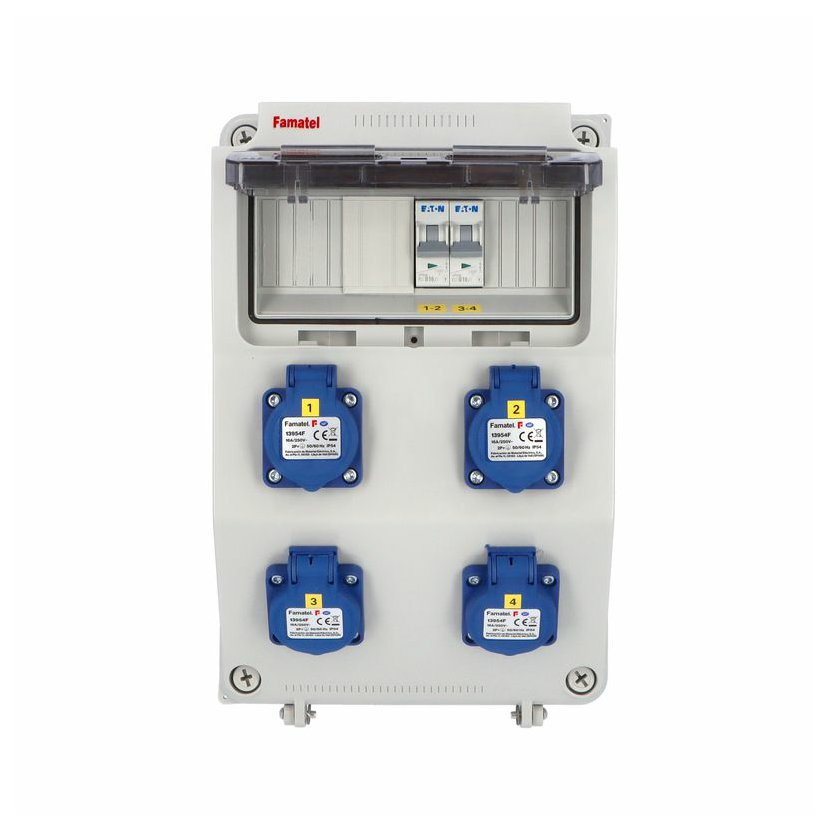 Zásuvková skříň FAMATEL v1120 - ZSF40200000.0 /3958 IP54 jištěná bez chrániče, zásuvky 4x230V, 2x16/5, přístroje EATON 10kA: 2xPL7-B16/1, 2xPL7-B16/3, použité pouzdro: 3958 - 330x215x155mm, barva:…