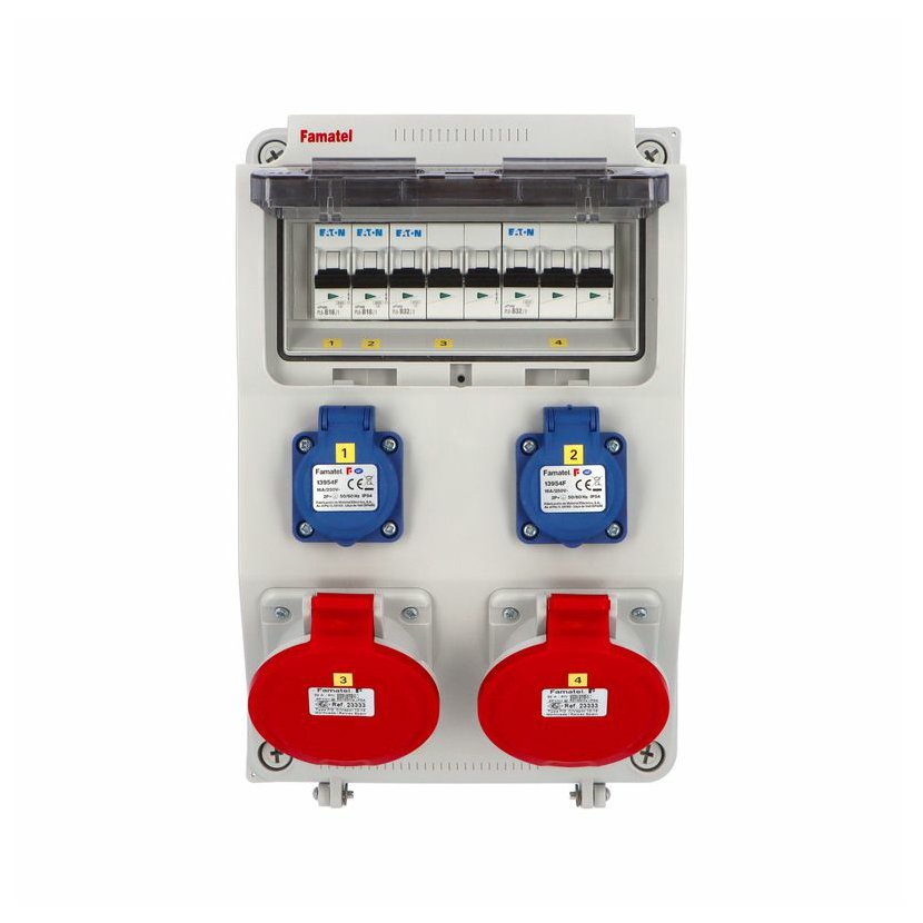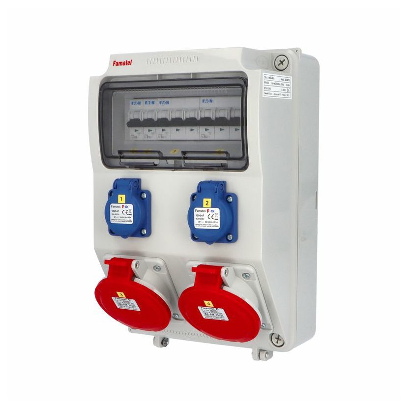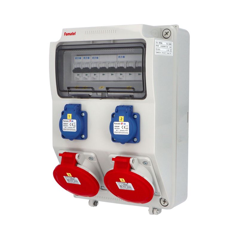 Zásuvková skříň (rozváděč nízkého napětí) FAMATEL v420-6kA-ZSF20002000.0 /3958 IP54 jištěná bez chrániče, zásuvky 2x230V/16A (s ochranným kolíkem dle ČSN), 2x400V/32A/5pól, jistící přístroje EATON 6kA: 2xPL6-B16/1, 2xPL6-B32/3, použité pouzdro: 3958 - celkem k dispozici 9mod. míst, rozměry: 330x215x155mm, plastová, materiál ABS, IK08, zkouška žhavou smyčkou 650°C, bezhalogenová a UV odolná, montáž na povrch, barva: světle šedá, rozsah teplot -25°C + 85°C, aplikované normy: IEC 61439-3 (Rozváděče nízkého napětí - Část 3: Rozvodnice určené k provozování laiky (DBO), balení: 1ks (fólie), zásuvky na 230V/16A s ochranným kolíkem dle ČSN, polykarbonátové okénko, jistící prvky EATON, PE svorkovnice součástí (6x16mm2), N svorkovnice součástí (6x16mm2), hladké stěny (bez prolisů) pro vyvrtání vstupního otvoru a následné osazení příslušnou vývodkou (pro CYKY 5x6; 4x10; 5x10 => M25; pro CYKY 5x16 => M32), max. připojitelný vstupní kabel = 4x25 nebo 5x16 (Cu), dodáno s průvodní dokumentací: štítkem rozváděče, návodem pro obsluhu a montáž, krycím listem (charakteristiky rozhraní), protokolem o kusové zkoušce, ES prohlášením o shodě, schématem zapojení a zkouškou oteplení pro rozváděče nízkého napětí. Pro montáž na hořlavé podklady je nutné použít nehořlavou podložku. Recyklační poplatek je zahrnut v ceně výrobku.