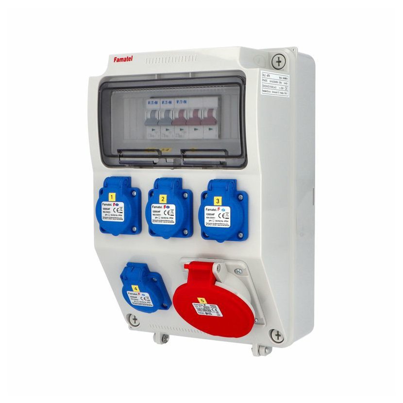Zásuvková skříň (rozváděč nízkého napětí) FAMATEL v575-ZSF40001000.0 /3958 IP54 jištěná bez chrániče, zásuvky 4x230V/16A (s ochranným kolíkem dle ČSN), 1x400V/32A/5pól, jistící přístroje EATON 10kA: 2xPL7-B16/1, 1xPL7-B32/3, použité pouzdro: 3958 - celkem k dispozici 9mod. míst, rozměry: 330x215x155mm, plastová, materiál ABS, IK08, zkouška žhavou smyčkou 650°C, bezhalogenová a UV odolná, montáž na povrch, barva: světle šedá, rozsah teplot -25°C + 85°C, aplikované normy: IEC 61439-3 (Rozváděče nízkého napětí - Část 3: Rozvodnice určené k provozování laiky (DBO), balení: 1ks (fólie), zásuvky na 230V/16A s ochranným kolíkem dle ČSN, polykarbonátové okénko, jistící prvky EATON, PE svorkovnice součástí (6x16mm2), N svorkovnice součástí (6x16mm2), hladké stěny (bez prolisů) pro vyvrtání vstupního otvoru a následné osazení příslušnou vývodkou (pro CYKY 5x6; 4x10; 5x10 => M25; pro CYKY 5x16 => M32), max. připojitelný vstupní kabel = 4x25 nebo 5x16 (Cu), dodáno s průvodní dokumentací: štítkem rozváděče, návodem pro obsluhu a montáž, krycím listem (charakteristiky rozhraní), protokolem o kusové zkoušce, EU prohlášením o shodě, schématem zapojení a zkouškou oteplení pro rozváděče nízkého napětí. Pro montáž na hořlavé podklady je nutné použít nehořlavou podložku. Recyklační poplatek je zahrnut v ceně výrobku.
