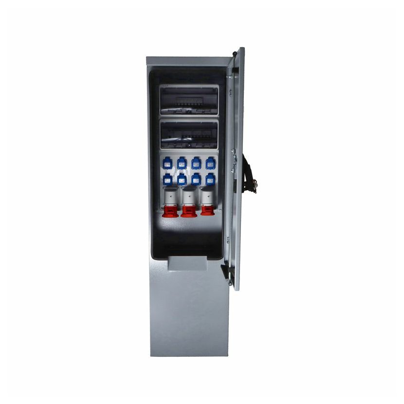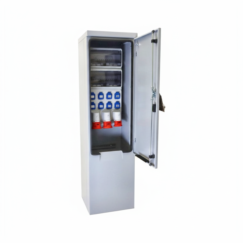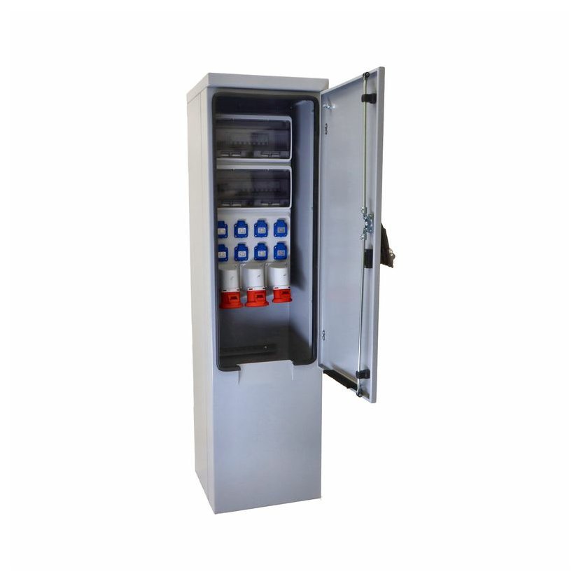 Zásuvková skříň (rozváděč nízkého napětí) v742ES-ZSF80102000.1 /3977 IP54 jištěná s chráničem 63/4/003-A, zásuvky 8x230V/16A (s ochranným kolíkem dle ČSN), 1x400V/16A/5pól úhel 90°, 2x400V/32A/5pól úhel 90°, jistící přístroje FAMATEL 10kA: 8x KBS1B16 B16/1, 1x KBS3B16 B16/3, 2x KBS3B32 B32/3, AUR8463A030 63/4/003-A na vstupu (citlivost na reziduální proud 30mA), použité pouzdro: 3977 - celkem k dispozici 32mod. míst, rozměry: 685x330x155mm, plastová, materiál ABS, IK08, zkouška žhavou smyčkou 650°C, bezhalogenová a UV odolná, montáž na povrch, barva: světle šedá, rozsah teplot -25°C +85°C, aplikované normy: IEC 61439-3 (Rozváděče nízkého napětí - Část 3: Rozvodnice určené k provozování laiky (DBO), balení: 1ks (fólie), zásuvky na 230V/16A s ochranným kolíkem dle ČSN, polykarbonátové okénko, jistící prvky FAMATEL, PE svorkovnice součástí (4ks 2x16mm2+4x10mm2), N svorkovnice součástí (4ks 2x16mm2+4x10mm2), stěny s předlisovanými vstupy pro vyvrtání vstupního otvoru a následné osazení příslušnou vývodkou (pro CYKY 5x6; 4x10; 5x10 => M25; pro CYKY 5x16 => M32), max. připojitelný vstupní kabel = 4x25 nebo 5x16 (Cu), dodáno s průvodní dokumentací: štítkem rozváděče, návodem pro obsluhu a montáž, krycím listem (charakteristiky rozhraní), protokolem o kusové zkoušce, EU prohlášením o shodě, schématem zapojení a zkouškou oteplení pro rozváděče nízkého napětí. Recyklační poplatek je zahrnut v ceně výrobku.