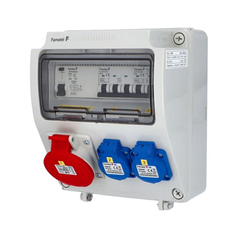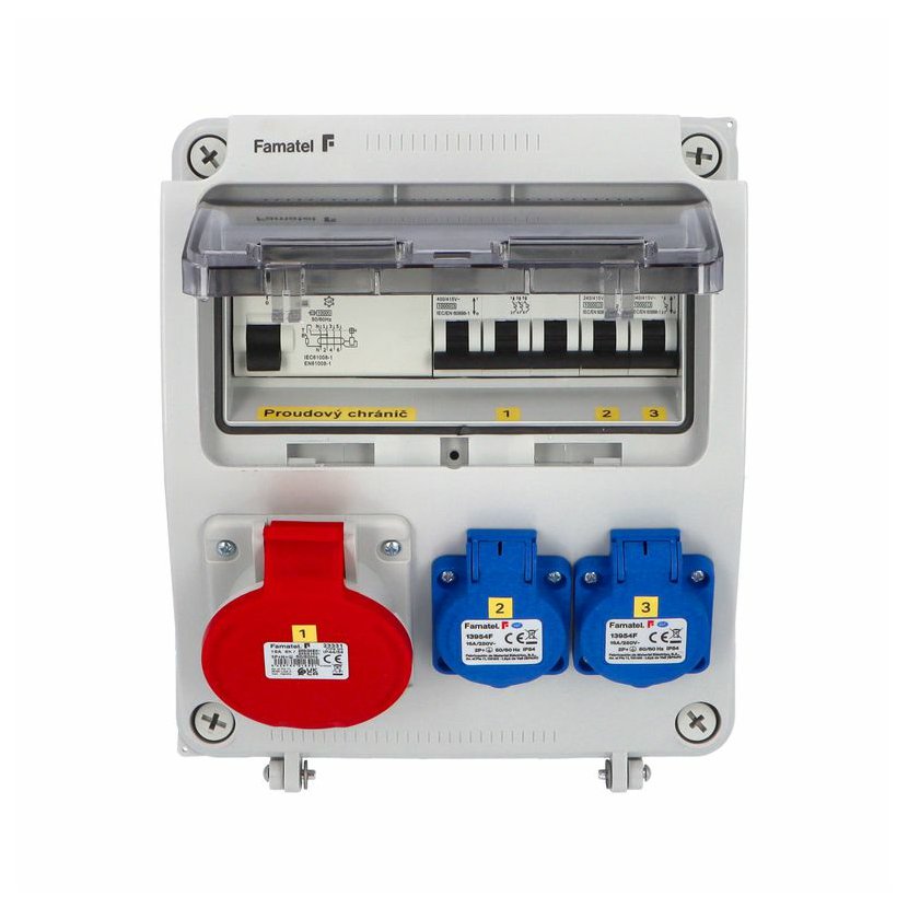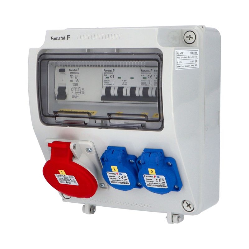 Zásuvková skříň (rozváděč nízkého napětí) FAMATEL vf165-ZSF20100000.1 /3957 IP54/IP20C jištěná s chráničem 63/4/003-A, zásuvky 2x230V/16A (s ochranným kolíkem dle ČSN), 1x400V/16A/5pól, jistící přístroje FAMATEL 10kA: 2xKBS1B16 B16/1, 1xKBS3B16 B16/3, AUR8463A030 63/4/003-A na vstupu (citlivost na reziduální proud 30mA), použité pouzdro: 3957 - celkem k dispozici 9mod. míst, rozměry: 245x215x155mm, plastová, materiál ABS, IK08, zkouška žhavou smyčkou 650°C, bezhalogenová a UV odolná, montáž na povrch, barva: světle šedá, rozsah teplot -25°C +85°C, aplikované normy: IEC 61439-3 (Rozváděče nízkého napětí - Část 3: Rozvodnice určené k provozování laiky (DBO), balení: 1ks (fólie), zásuvky na 230V/16A s ochranným kolíkem dle ČSN, polykarbonátové okénko, jistící prvky FAMATEL, PE svorkovnice součástí (6x16mm2), N svorkovnice součástí (6x16mm2), hladké stěny (bez prolisů) pro vyvrtání vstupního otvoru a následné osazení příslušnou vývodkou (pro CYKY 5x6; 4x10; 5x10 => M25; pro CYKY 5x16 => M32), max. připojitelný vstupní kabel = 4x25 nebo 5x16 (Cu), dodáno s průvodní dokumentací: štítkem rozváděče, návodem pro obsluhu a montáž, krycím listem (charakteristiky rozhraní), protokolem o kusové zkoušce, ES prohlášením o shodě, schématem zapojení a zkouškou oteplení pro rozváděče nízkého napětí. Pro montáž na hořlavé podklady je nutné použít nehořlavou podložku. Recyklační poplatek je zahrnut v ceně výrobku.