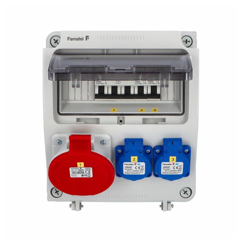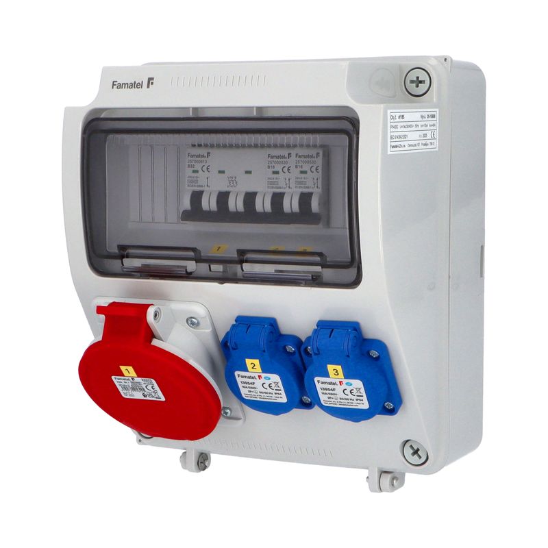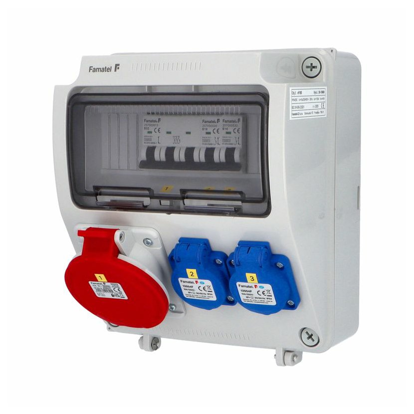 Zásuvková skříň (rozváděč nízkého napětí) FAMATEL vf185-6kA-ZSF20001000.0 /3957 IP54, jištěná bez chrániče, zásuvky 1x400V/32A, 2x230V/16A, přístroje FAMATEL 6kA: 2xKBF1B16 B16/1, 1xKBF3B32 B32/3, použité pouzdro: 3957 - celkem k dispozici 9mod. míst, rozměry: 245x215x155mm, plastová, materiál ABS, IK08, zkouška žhavou smyčkou 650°C, bezhalogenová a UV odolná, montáž na povrch, barva: světle šedá, rozsah teplot -25°C +85°C, aplikované normy: IEC 61439-3 (Rozváděče nízkého napětí - Část 3: Rozvodnice určené k provozování laiky (DBO), balení: 1ks (fólie), zásuvky na 230V/16A s ochranným kolíkem dle ČSN, polykarbonátové okénko, jistící prvky FAMATEL, PE svorkovnice součástí (6x16mm2), N svorkovnice součástí (6x16mm2), hladké stěny (bez prolisů) pro vyvrtání vstupního otvoru a následné osazení příslušnou vývodkou (pro CYKY 5x6; 4x10; 5x10 => M25; pro CYKY 5x16 => M32), max. připojitelný vstupní kabel = 4x25 nebo 5x16 (Cu), dodáno s průvodní dokumentací: štítkem rozváděče, návodem pro obsluhu a montáž, krycím listem (charakteristiky rozhraní), protokolem o kusové zkoušce, ES prohlášením o shodě, schématem zapojení a zkouškou oteplení pro rozváděče nízkého napětí. Pro montáž na hořlavé podklady je nutné použít nehořlavou podložku. Recyklační poplatek je zahrnut v ceně výrobku.