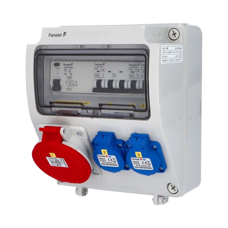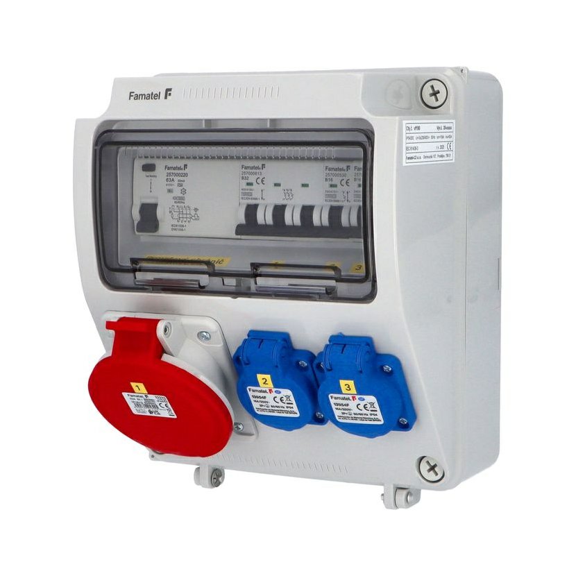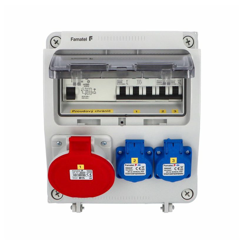 Zásuvková skříň (rozváděč nízkého napětí) FAMATEL vf190-ZSF20001000.1 /3957 IP54 jištěná s chráničem 63/4/003-A, zásuvky 2x230V/16A (s ochranným kolíkem dle ČSN), 1x400V/32A/5pól, jistící přístroje FAMATEL 10kA: 2xKBS1B16 B16/1, 1xKBS3B32 B32/3, AUR8463A030 63/4/003-A na vstupu (citlivost na reziduální proud 30mA), použité pouzdro: 3957 - celkem k dispozici 9mod. míst, rozměry: 245x215x155mm, plastová, materiál ABS, IK08, zkouška žhavou smyčkou 650°C, bezhalogenová a UV odolná, montáž na povrch, barva: světle šedá, rozsah teplot -25°C + 85°C, aplikované normy: IEC 61439-3 (Rozváděče nízkého napětí - Část 3: Rozvodnice určené k provozování laiky (DBO), balení: 1ks (fólie), zásuvky na 230V/16A s ochranným kolíkem dle ČSN, polykarbonátové okénko, jistící prvky FAMATEL, PE svorkovnice součástí (6x16mm2), N svorkovnice součástí (6x16mm2), hladké stěny (bez prolisů) pro vyvrtání vstupního otvoru a následné osazení příslušnou vývodkou (pro CYKY 5x6; 4x10; 5x10 => M25; pro CYKY 5x16 => M32), max. připojitelný vstupní kabel = 4x25 nebo 5x16 (Cu), dodáno s průvodní dokumentací: štítkem rozváděče, návodem pro obsluhu a montáž, krycím listem (charakteristiky rozhraní), protokolem o kusové zkoušce, ES prohlášením o shodě, schématem zapojení a zkouškou oteplení pro rozváděče nízkého napětí. Pro montáž na hořlavé podklady je nutné použít nehořlavou podložku. Recyklační poplatek je zahrnut v ceně výrobku.