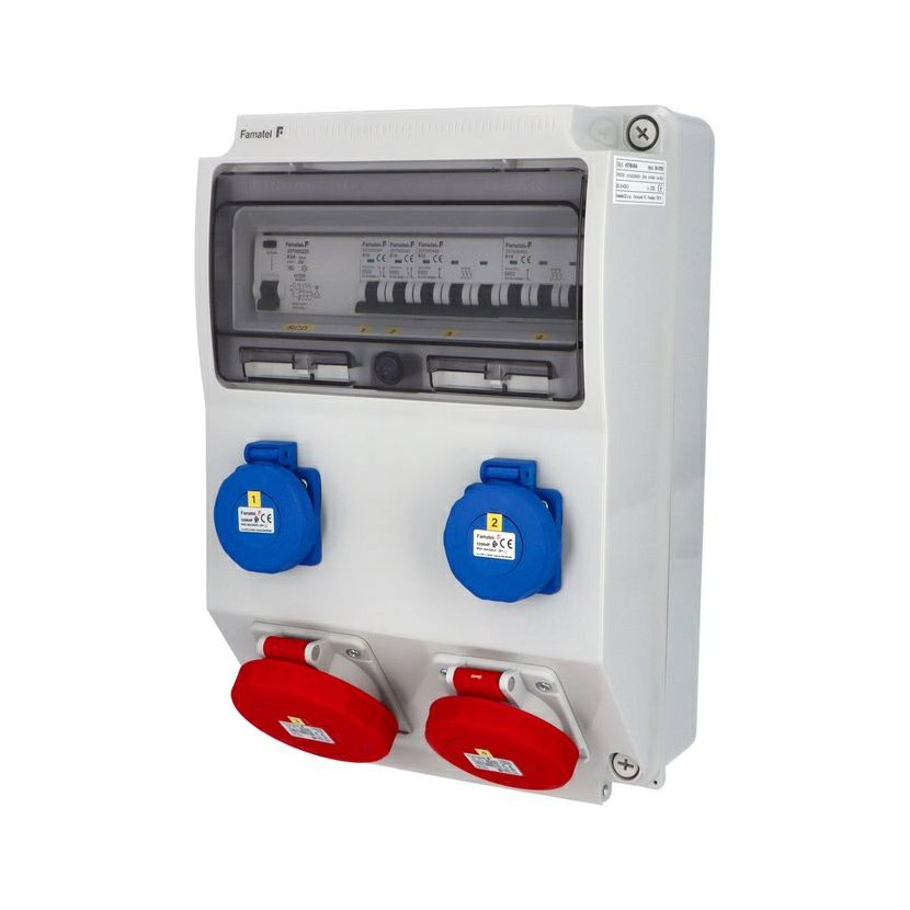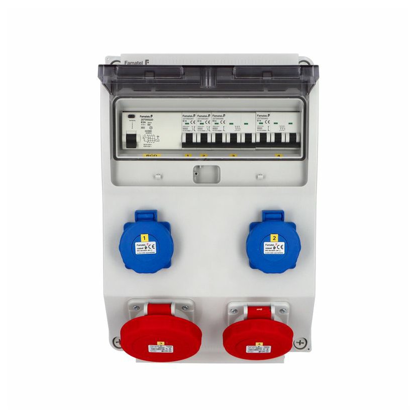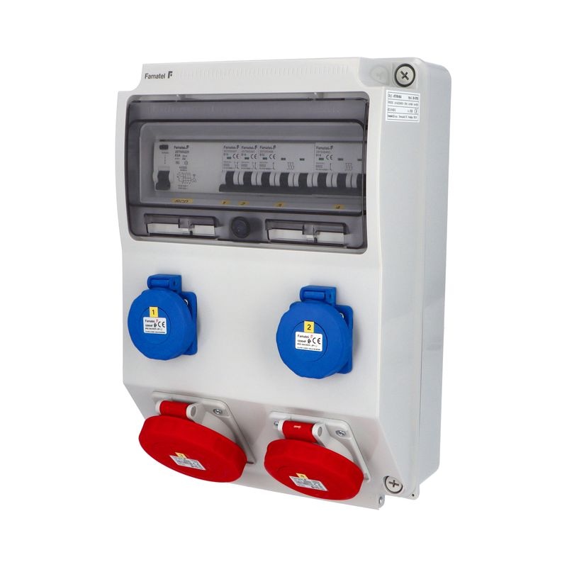 Zásuvková skříň (rozváděč nízkého napětí) FAMATEL vf3106-ZSF20101000.1 /3959 IP65 jištěná s chráničem 63/4/003-A, zásuvky 2x230V/16A (s ochranným kolíkem dle ČSN), 1x400V/16A/5pól, 1x400V/32A/5pól , jistící přístroje FAMATEL 10kA: 2xKBS1B16 B16/1, 1xKBS3B16 B16/3, 1xKBS3B32 B32/3, AUR8463A030 63/4/003-A na vstupu (citlivost na reziduální proud 30mA), použité pouzdro: 3959 - celkem k dispozici 12mod. míst, rozměry: 390x265x150mm, plastová, materiál ABS, IK08, zkouška žhavou smyčkou 650°C, bezhalogenová a UV odolná, montáž na povrch, barva: světle šedá, rozsah teplot -25°C +85°C, aplikované normy: IEC 61439-3 (Rozváděče nízkého napětí - Část 3: Rozvodnice určené k provozování laiky (DBO), balení: 1ks (fólie), zásuvky na 230V/16A s ochranným kolíkem dle ČSN, polykarbonátové okénko, jistící prvky FAMATEL, PE svorkovice součástí (6x16mm2), N svorkovice součástí (6x16mm2), stěny s předlisovanými vstupy pro vyvrtání vstupního otvoru a následné osazení příslušnou vývodkou (pro CYKY 5x6; 4x10; 5x10 => M25; pro CYKY 5x16 => M32), max. připojitelný vstupní kabel = 4x25 nebo 5x16 (Cu), dodáno s průvodní dokumentací: štítkem rozváděče, návodem pro obsluhu a montáž, krycím listem (charakteristiky rozhraní), protokolem o kusové zkoušce, ES prohlášením o shodě, schématem zapojení a zkouškou oteplení pro rozváděče nízkého napětí. Pro montáž na hořlavé podklady je nutné použít nehořlavou podložku. Recyklační poplatek je zahrnut v ceně výrobku.
