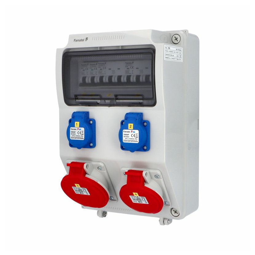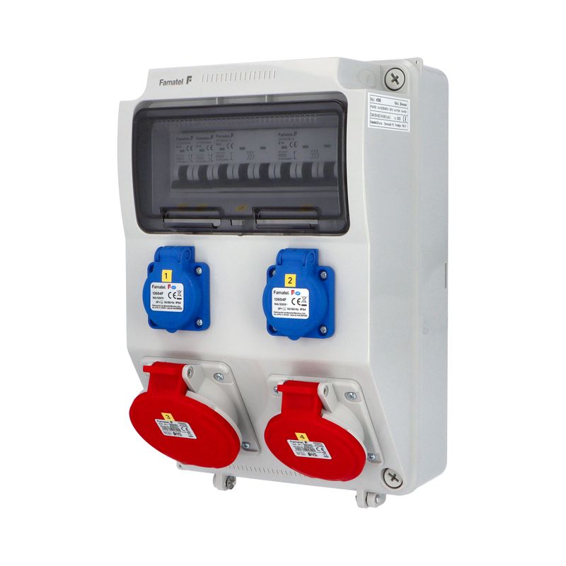 Zásuvková skříň (rozváděč nízkého napětí) FAMATEL vf385-ZSF20101000.0 /3958 IP54 jištěná bez chrániče, zásuvky 2x230V/16A (s ochranným kolíkem dle ČSN), 1x400V/16A/5pól, 1x400V/32A/5pól, přístroje FAMATEL 10kA: 2xKBS1B16 B16/1, 1xKBS3B16 B16/3, 1xKBS3B32 B32/3, použité pouzdro: 3958 - celkem k dispozici 9mod. míst, rozměry: 330x215x155mm, plastová, materiál ABS, IK08, zkouška žhavou smyčkou 650°C, bezhalogenová a UV odolná, montáž na povrch, barva: světle šedá, rozsah teplot -25°C + 85°C, aplikované normy: IEC 61439-3 (Rozváděče nízkého napětí - Část 3: Rozvodnice určené k provozování laiky (DBO), balení: 1ks (fólie), zásuvky na 230V/16A s ochranným kolíkem dle ČSN, polykarbonátové okénko, jistící prvky FAMATEL, PE svorkovnice součástí (6x16mm2), N svorkovnice součástí (6x16mm2), hladké stěny (bez prolisů) pro vyvrtání vstupního otvoru a následné osazení příslušnou vývodkou (pro CYKY 5x6; 4x10; 5x10 => M25; pro CYKY 5x16 => M32), max. připojitelný vstupní kabel = 4x25 nebo 5x16 (Cu), dodáno s průvodní dokumentací: štítkem rozváděče, návodem pro obsluhu a montáž, krycím listem (charakteristiky rozhraní), protokolem o kusové zkoušce, ES prohlášením o shodě, schématem zapojení a zkouškou oteplení pro rozváděče nízkého napětí. Pro montáž na hořlavé podklady je nutné použít nehořlavou podložku. Recyklační poplatek je zahrnut v ceně výrobku.