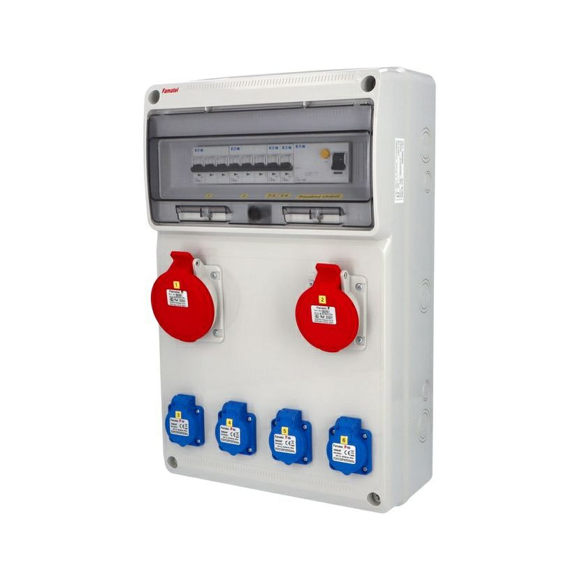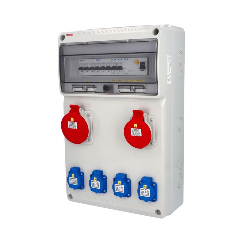 Zásuvková skříň (rozváděč nízkého napětí) FAMATEL vf625-6kA-ZSF40101000.1 /3952 IP54 jištěná s chráničem 63/4/003-A, zásuvky 4x230V/16A (s ochranným kolíkem dle ČSN), 1x400V/16A/5pól, 1x400V/32A/5pól, jistící přístroje FAMATEL 6kA: 2xKBF1B16 B16/1, 1xKBF3B16 B16/3, 1xKBF3B32 B32/3, AUR8463A030 63/4/003-A na vstupu (citlivost na reziduální proud 30mA), použité pouzdro: 3952 - celkem k dispozici 16mod. míst, rozměry: 500x330x155mm, plastová, materiál ABS, IK08, zkouška žhavou smyčkou 650°C, bezhalogenová a UV odolná, montáž na povrch, barva: světle šedá, rozsah teplot -25°C + 85°C, aplikované normy: IEC 61439-3 (Rozváděče nízkého napětí - Část 3: Rozvodnice určené k provozování laiky (DBO), balení: 1ks (fólie), zásuvky na 230V/16A s ochranným kolíkem dle ČSN, polykarbonátové okénko, jistící prvky FAMATEL, PE svorkovnice součástí (2ks 2x16mm2+4x10mm2), N svorkovnice součástí (2ks 2x16mm2+4x10mm2), stěny s předlisovanými vstupy pro vyvrtání vstupního otvoru a následné osazení příslušnou vývodkou (pro CYKY 5x6; 4x10; 5x10 => M25; pro CYKY 5x16 => M32), max. připojitelný vstupní kabel = 4x25 nebo 5x16 (Cu), dodáno s průvodní dokumentací: štítkem rozváděče, návodem pro obsluhu a montáž, krycím listem (charakteristiky rozhraní), protokolem o kusové zkoušce, ES prohlášením o shodě, schématem zapojení a zkouškou oteplení pro rozváděče nízkého napětí. Pro montáž na hořlavé podklady je nutné použít nehořlavou podložku. Pro montáž na hořlavé podklady je nutné použít nehořlavou podložku. Recyklační poplatek je zahrnut v ceně výrobku.